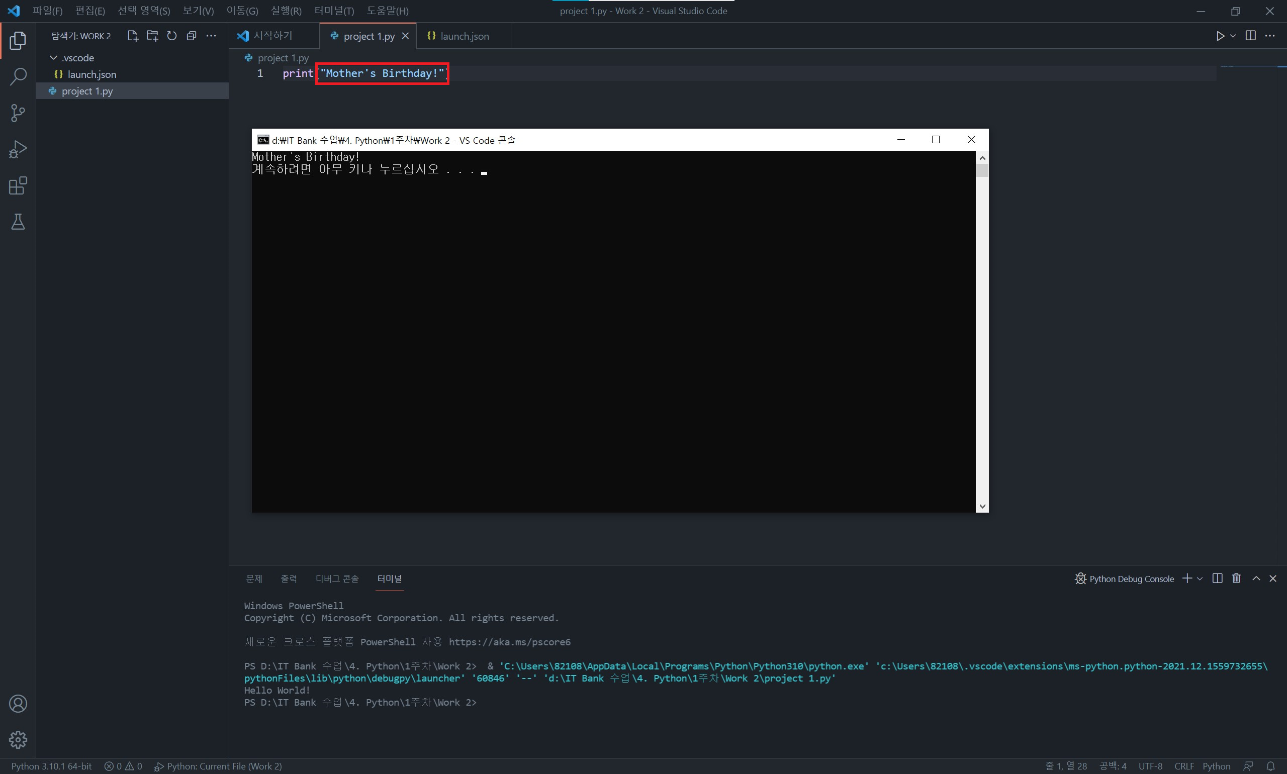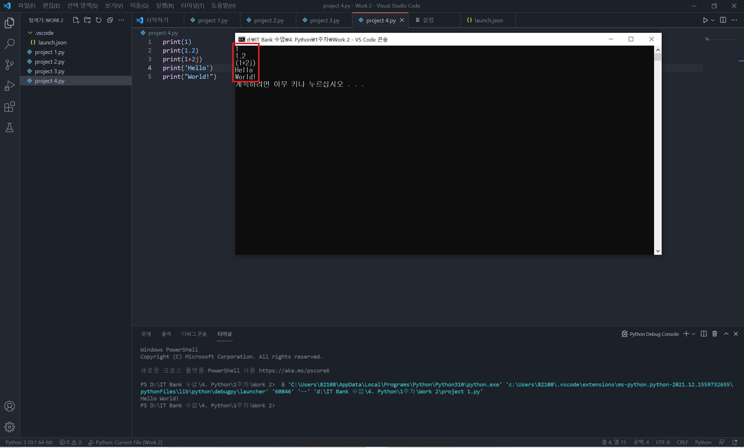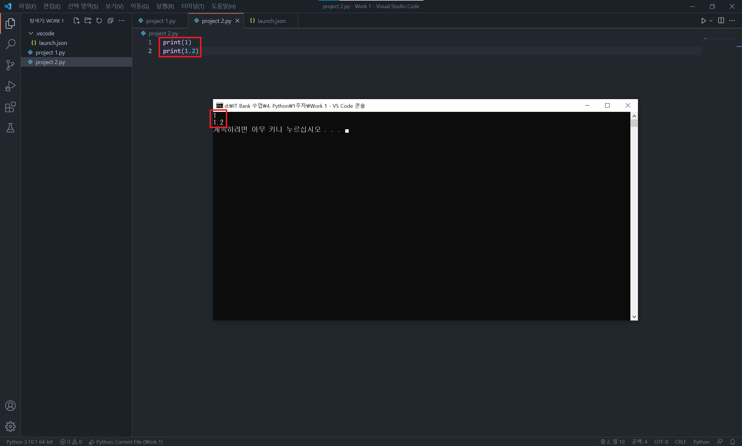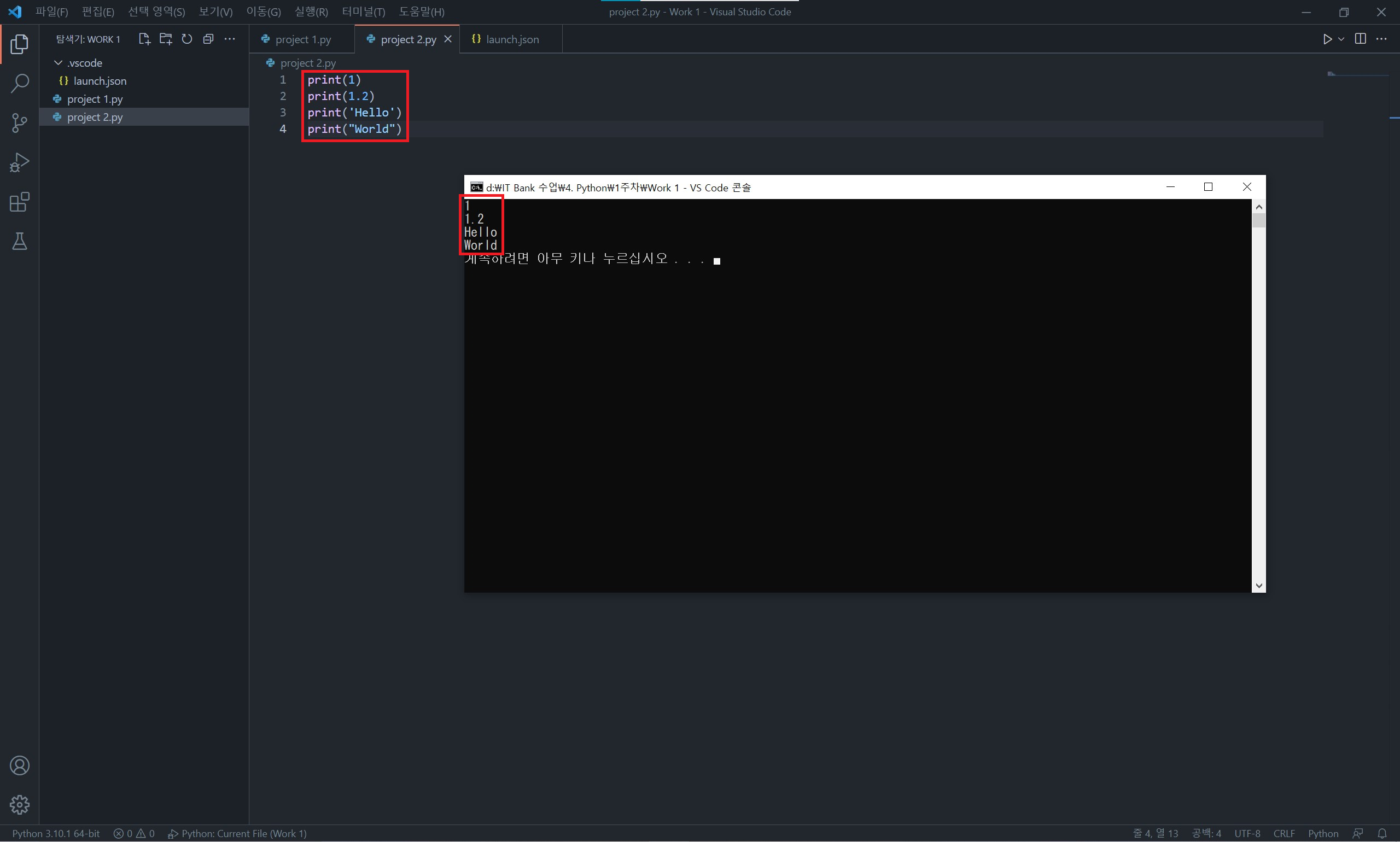 숫자형 데이터를 출력하기 위해선 print() 함수 안에 해당 값을 입력하면 되고, 문자형 데이터나 문자열형 데이터를 출력할 때는 print('문자')와 print("문자열") 형식으로 입력해 주면 됩니다.