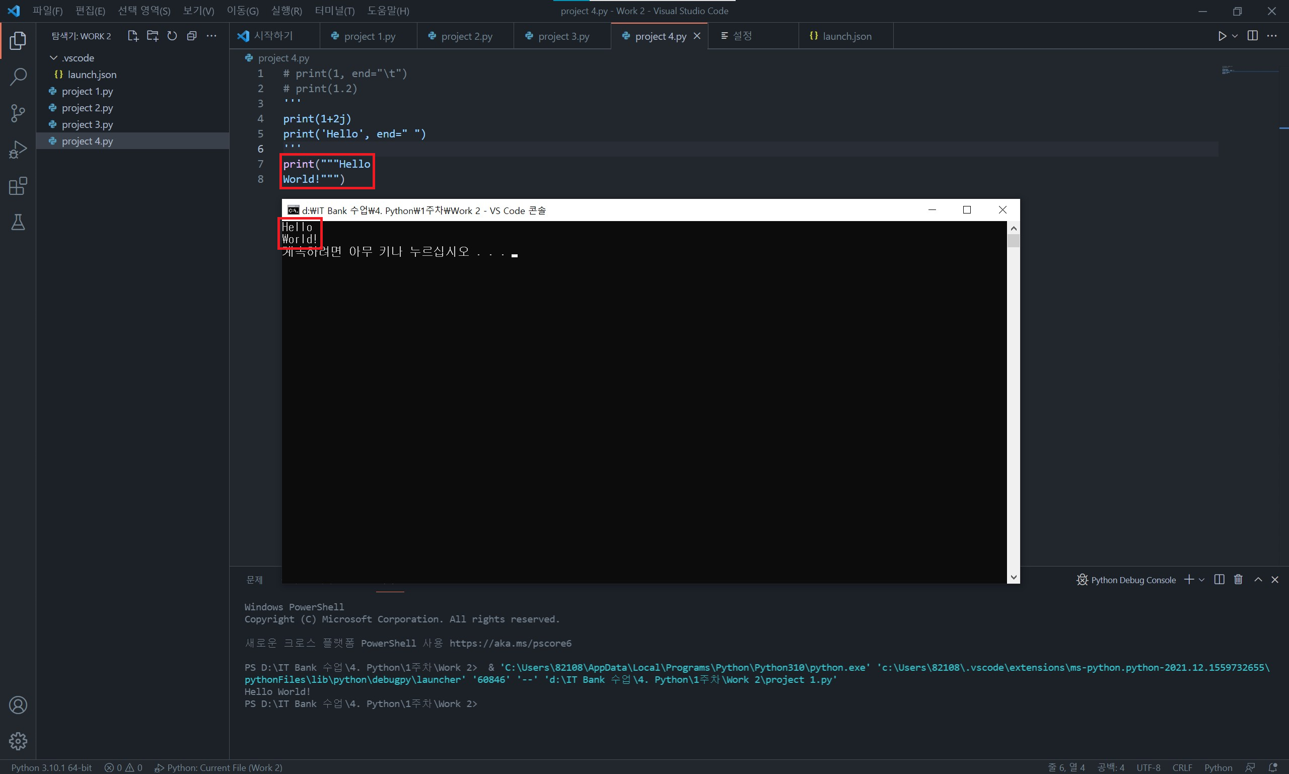 위의 사진을 보면 ''' '''와 """ """ 사이에 있는 문자열이 출력되는 것을 볼 수 있는데, ''' '''와 """ """ 의 정확한 사용은 여러 줄 문자열이라고 합니다. 주석 처리 역할만 있다고 생각하면 안 됩니다.