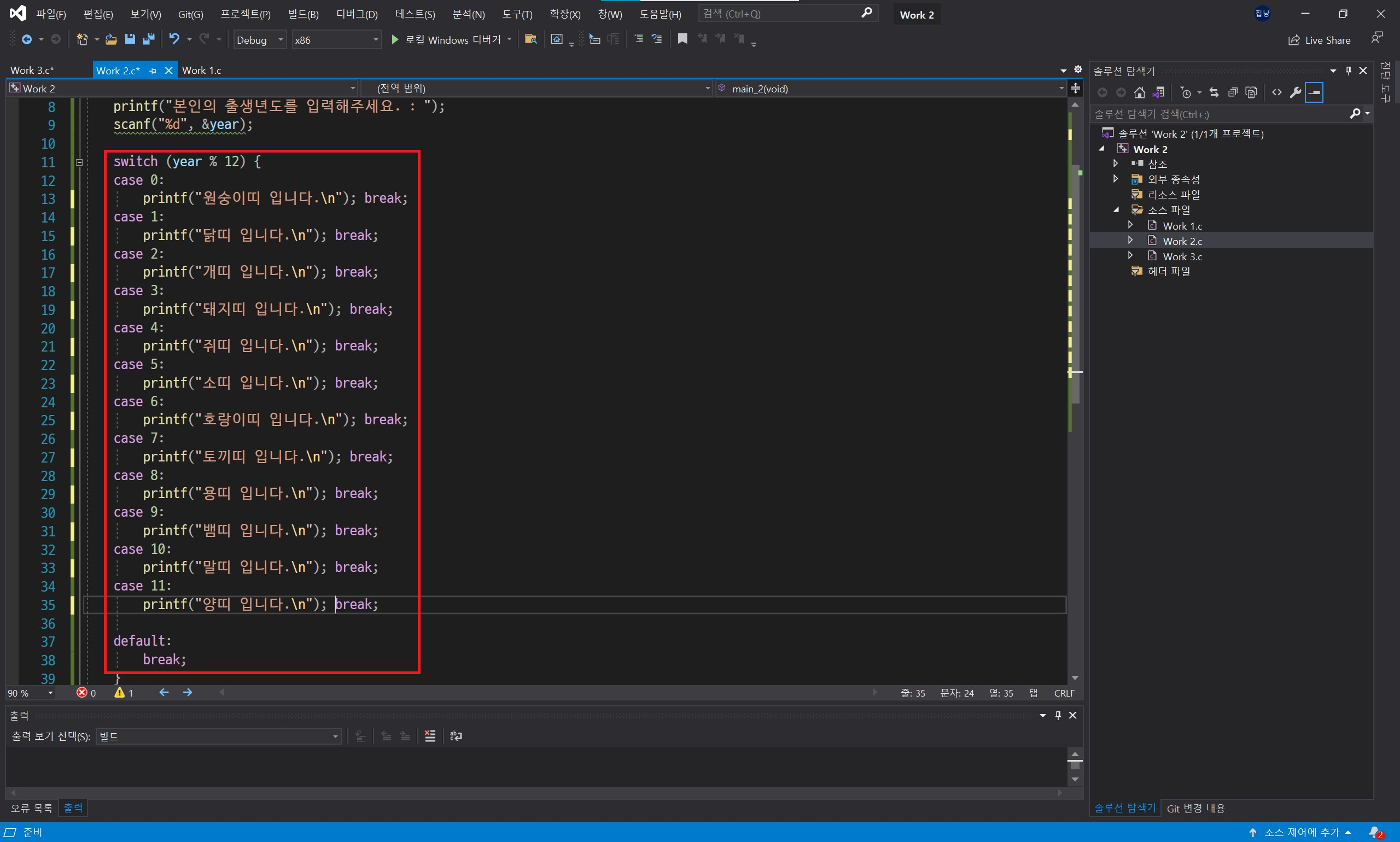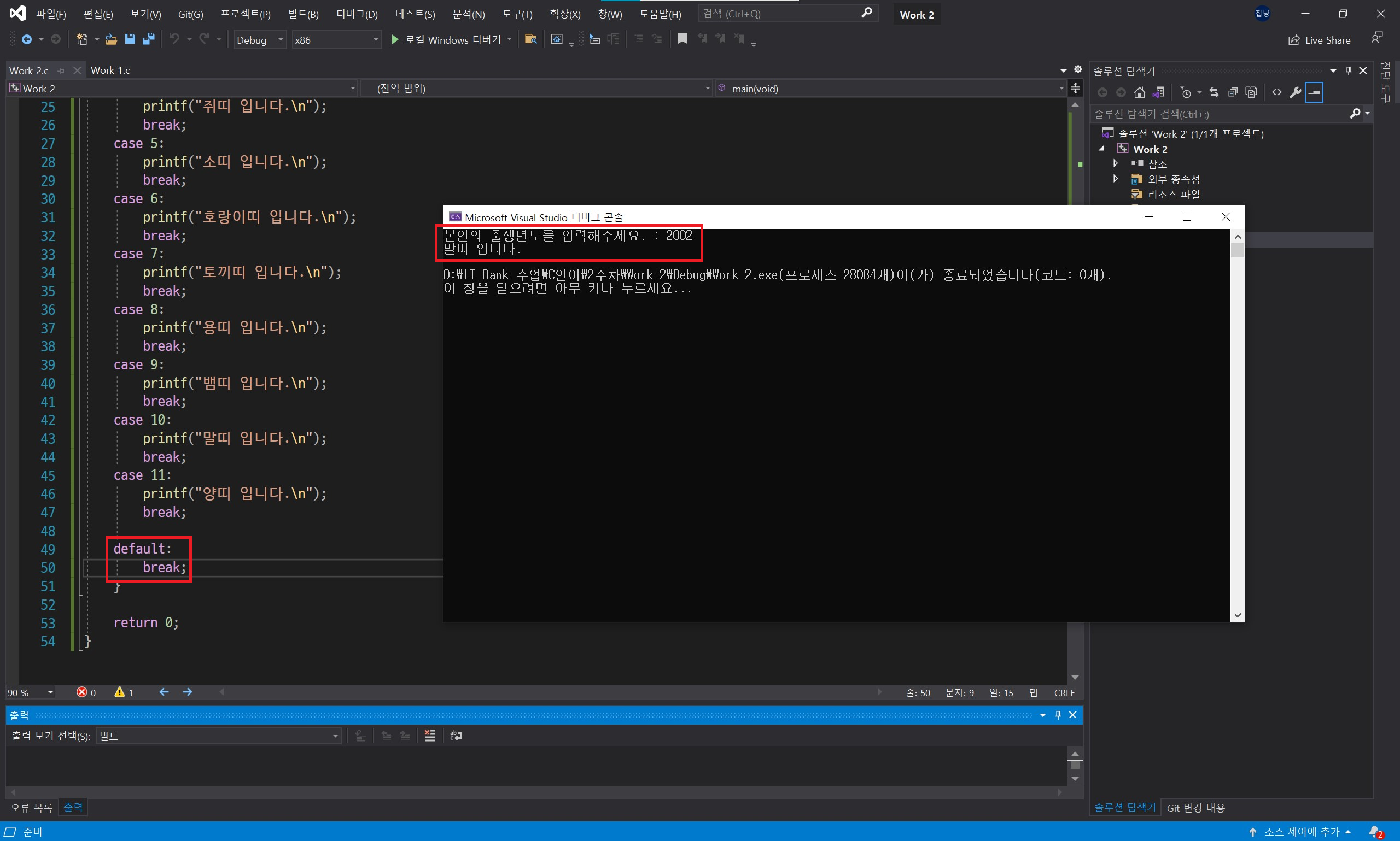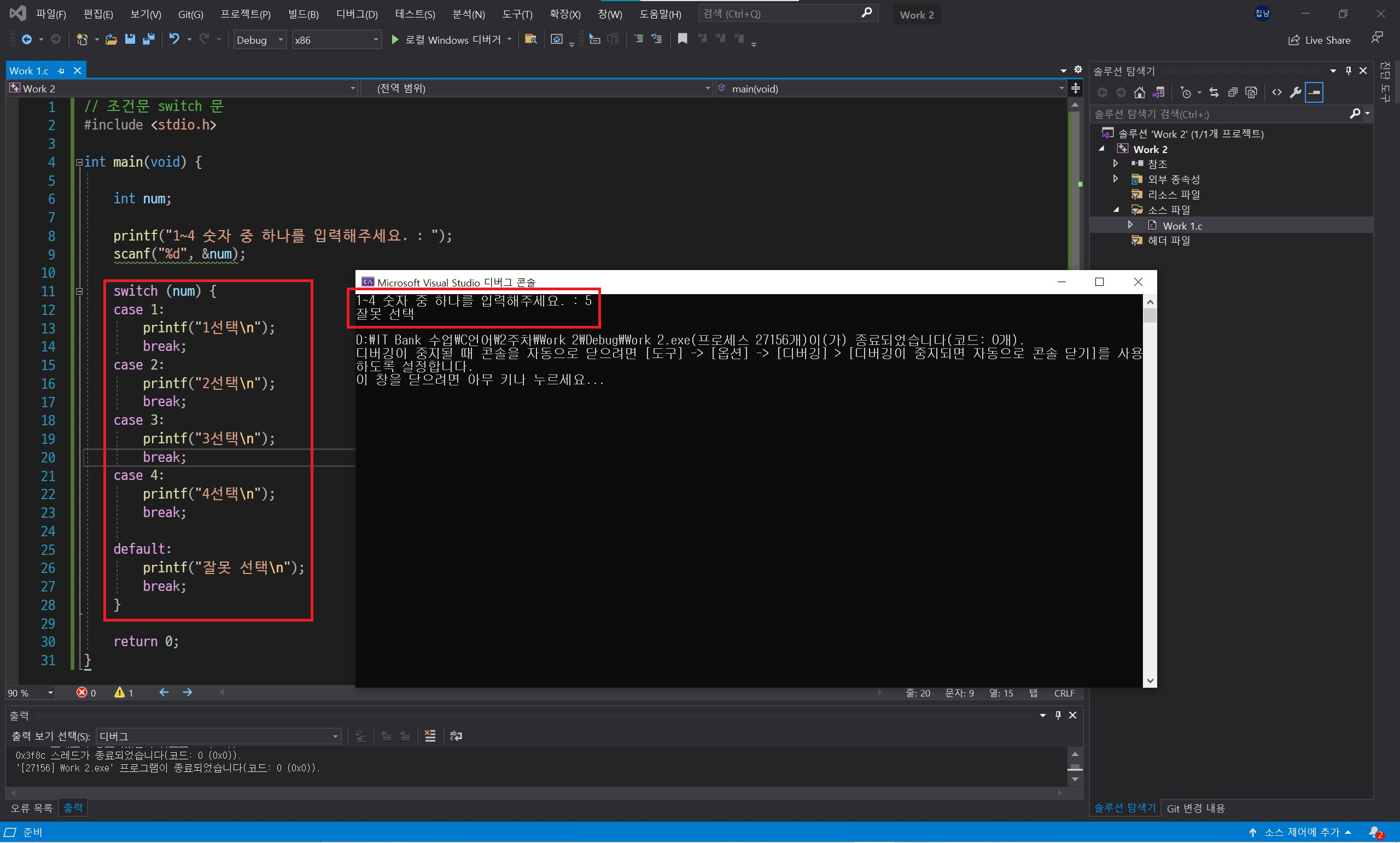 모든 경우의 수에 따른 결과를 case 문으로 작성하면 마지막에 default 문도 작성해줍니다. 이 또한 필수는 아니지만 default 문은 case 문의 조건에 전부 일치하지 않는 경우가 나올 경우 수행하게 됩니다.