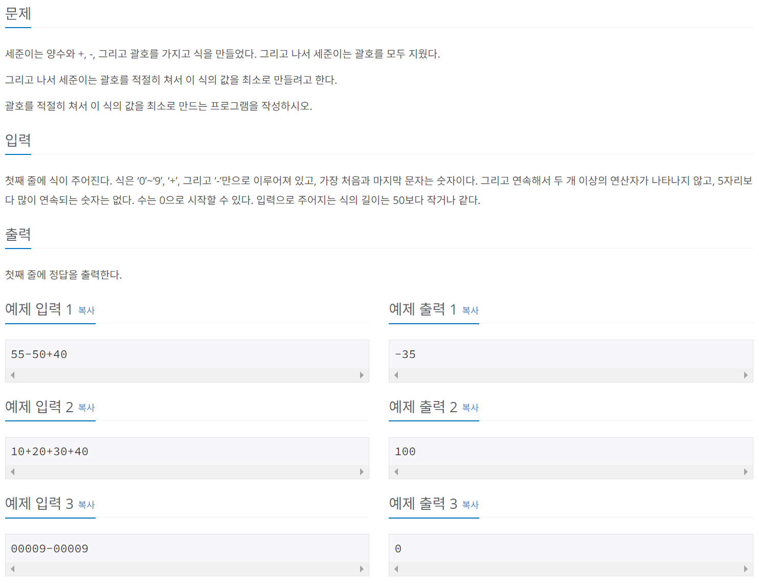 첫째 줄에 식이 주어진다. 식은 ‘0’~‘9’, ‘+’, 그리고 ‘-’만으로 이루어져 있고, 가장 처음과 마지막 문자는 숫자이다. 그리고 연속해서 두 개 이상의 연산자가 나타나지 않고, 5자리보다