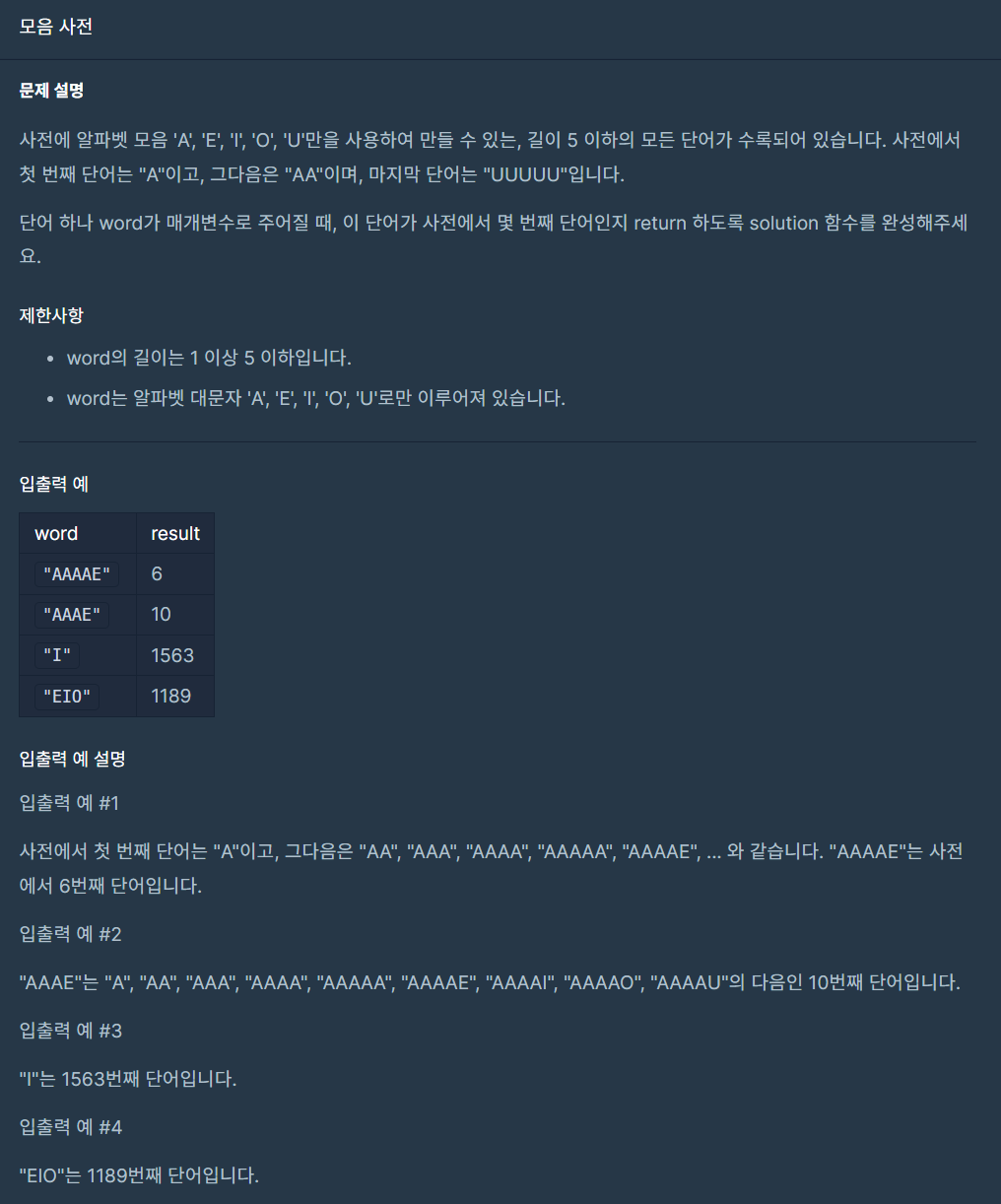 해당 문제는 단어가 1자리부터 최대 5자리까지만 존재하므로 모든 경우를 구한 뒤에 찾는 것으로 해결하였다.