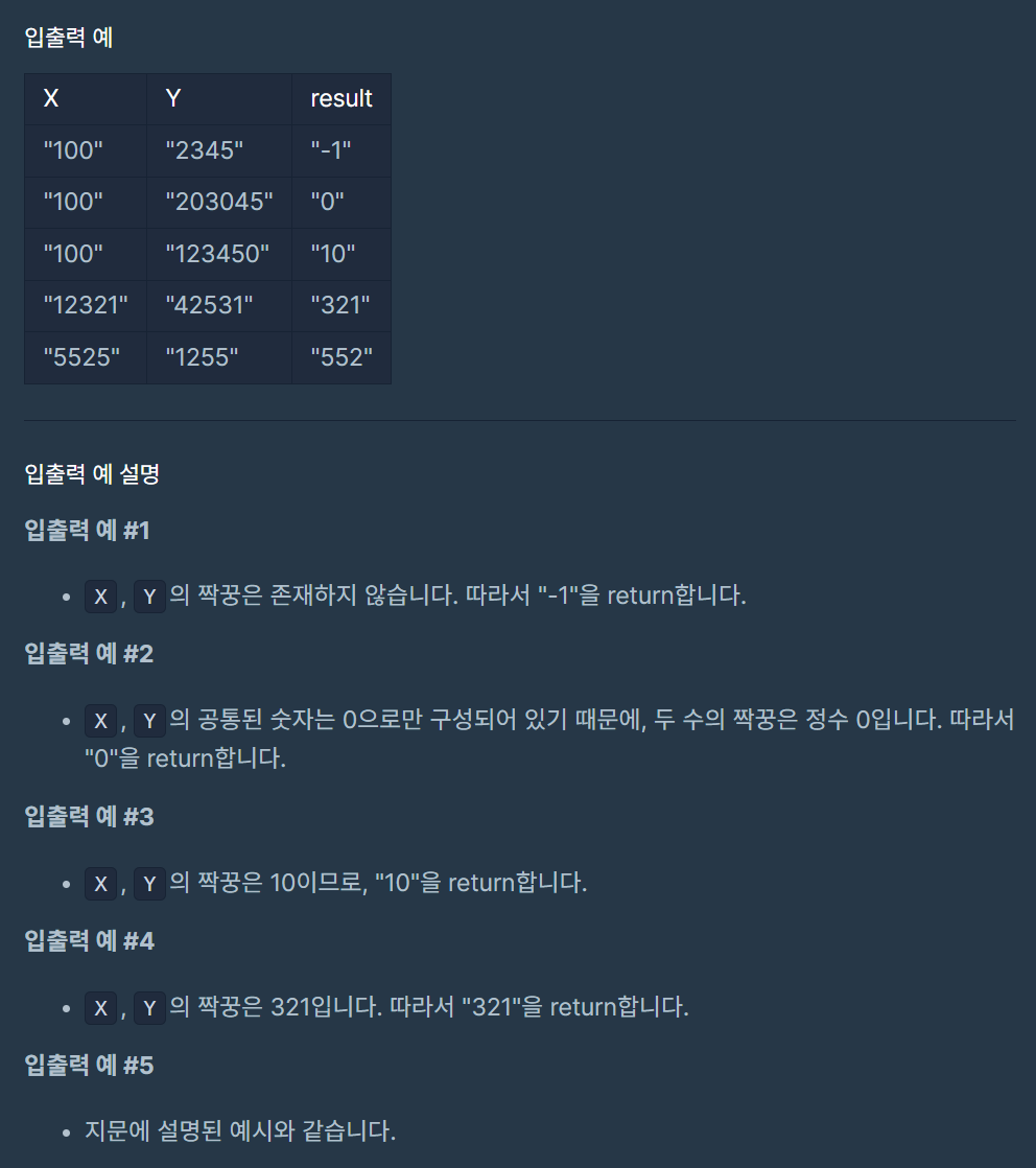 - 만약 만든 정답이 공백이면 짝꿍이 존재하지 않는 경우이므로 정답은 -1이다. if (len(answer) == 0): answer = "-1"