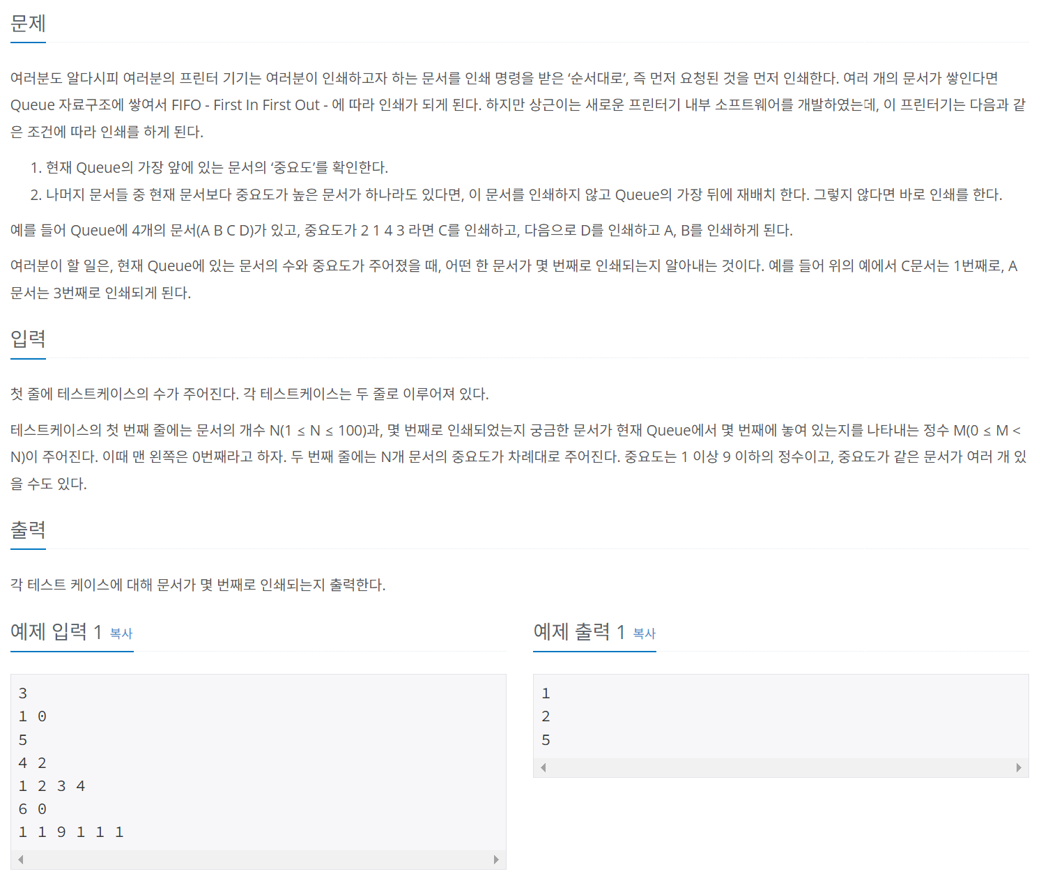 - 문서의 중요도를 리스트로 입력받고 deque 자료구조로 저장한다. queue = deque(list(map(int, sys.stdin.readline().split())))