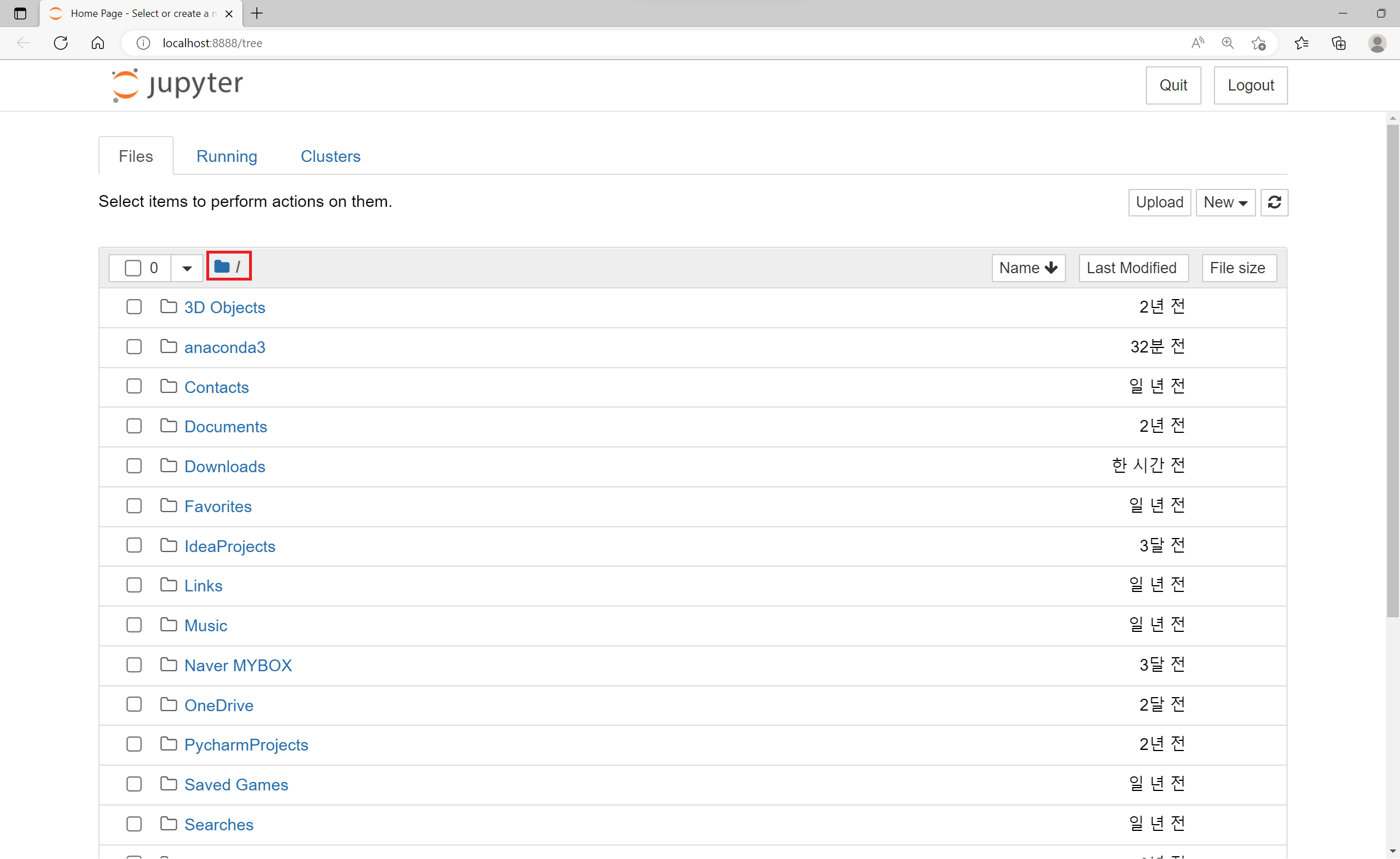 Jupyter Notebook에 들어가면 파란색 폴더 아이콘이 있습니다. 이 아이콘이 우리가 anaconda를 설치한 경로이며, 폴더와 파일을 만들어줄 곳입니다.