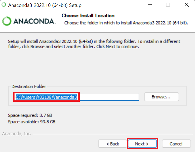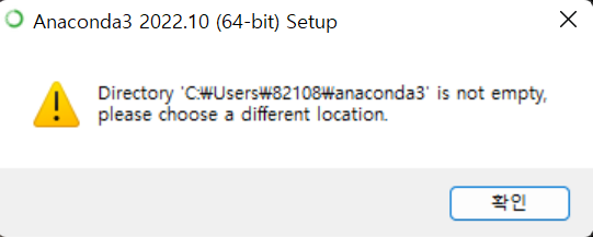 설치되는 위치를 확인했다면 설치를 마저 진행합니다. 이때 오류가 뜨는 경우도 있습니다. 이런 경우에는 설치가 되는 폴더에 들어가 anaconda 파일을 완전히 삭제해 주고 다시 설치해 주면 됩니다.