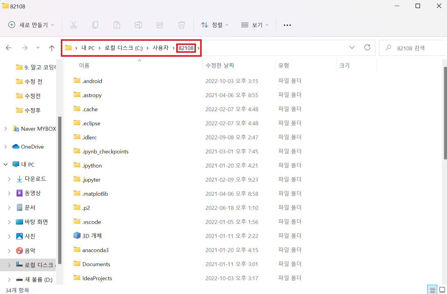 나오는 위치는 내 PC, 로컬 디스크, 사용자에 생성되어 있는 폴더의 위치입니다. 해당 위치에 anaconda가 설치되게 됩니다.