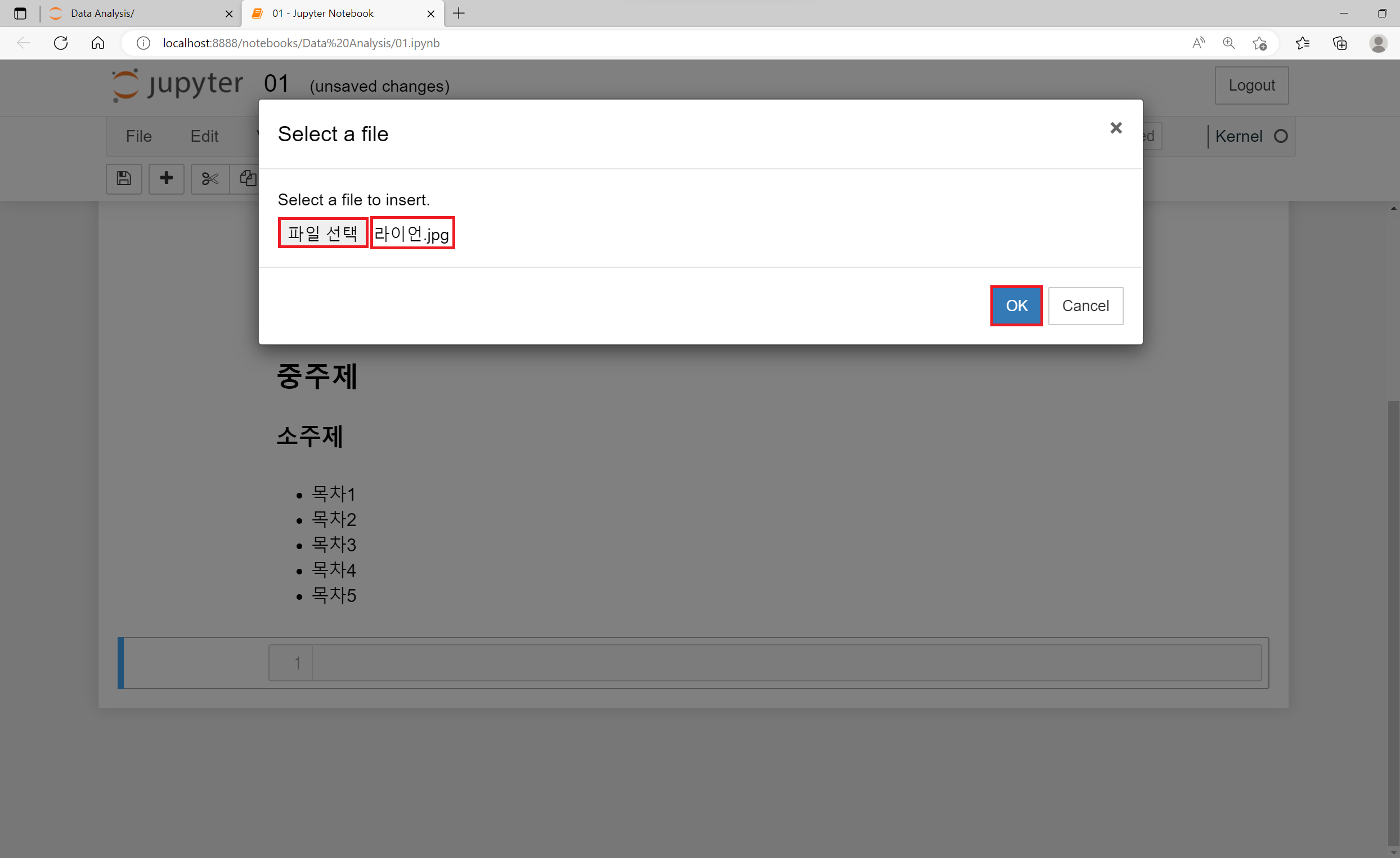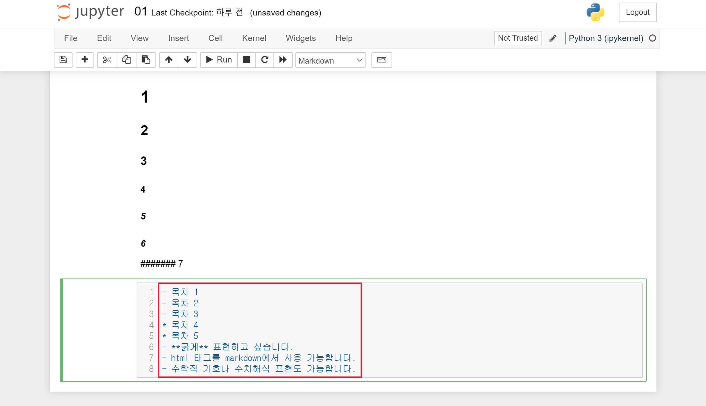 Jupyter Notebok에서 설명문, 주석을 작성해 주는 방법은 Code라고 적힌 부분을 Markdown으로 바꿔주면 됩니다.