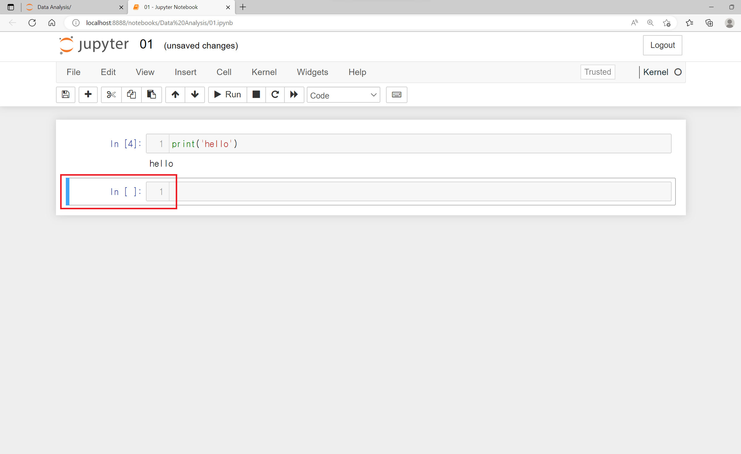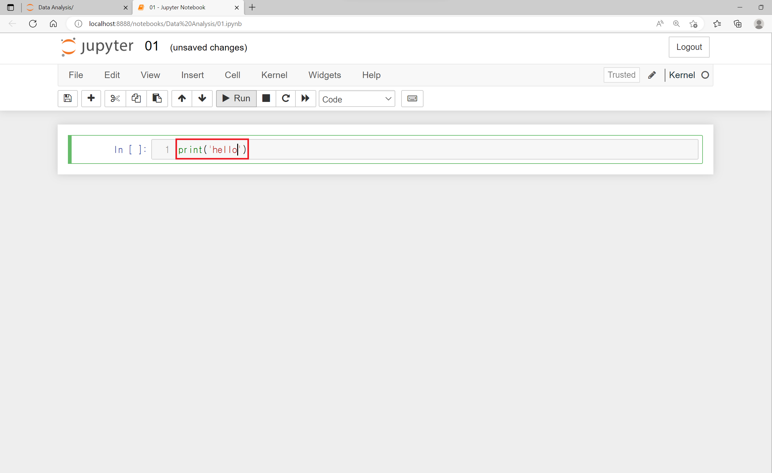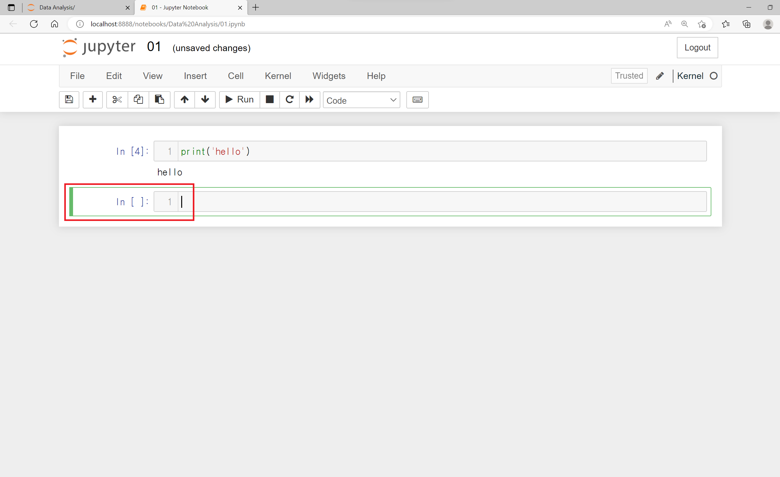 Jupyter Notebook에서는 명령문 공간이 파란색이면 읽는 모드, 녹색이면 작성하는 모드라고 생각하면 됩니다.