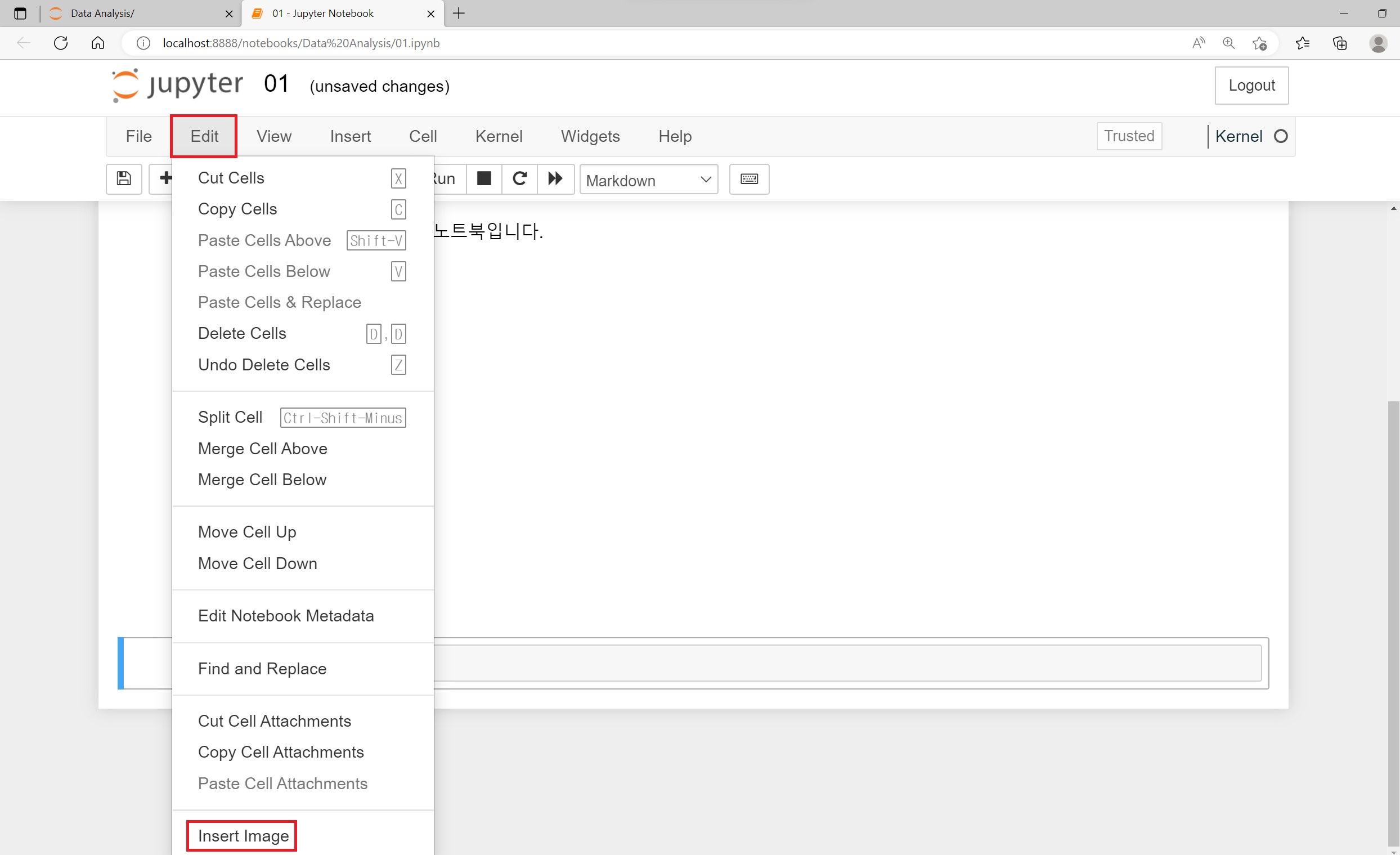 이미지를 넣는 방법은 다음과 같이 Edit를 눌러 Insert Image를 선택하고 원하는 이미지를 선택해 주면 이미지를 불러오는 코드가 작성됩니다.