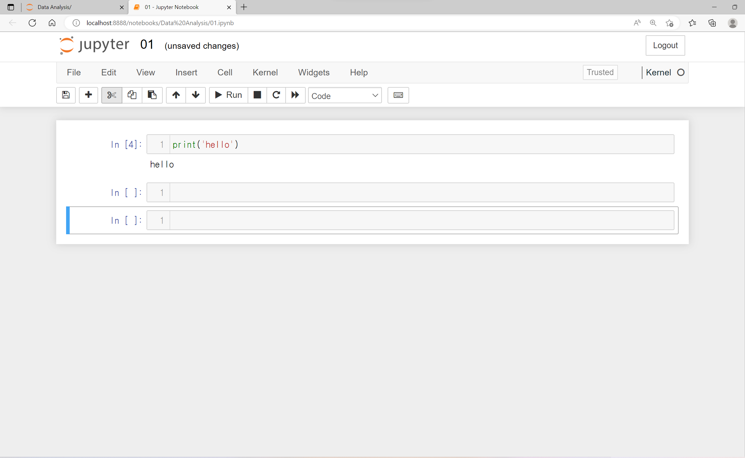 Jupyter Notebook에서는 명령문 공간이 파란색이면 읽는 모드, 녹색이면 작성하는 모드라고 생각하면 됩니다.