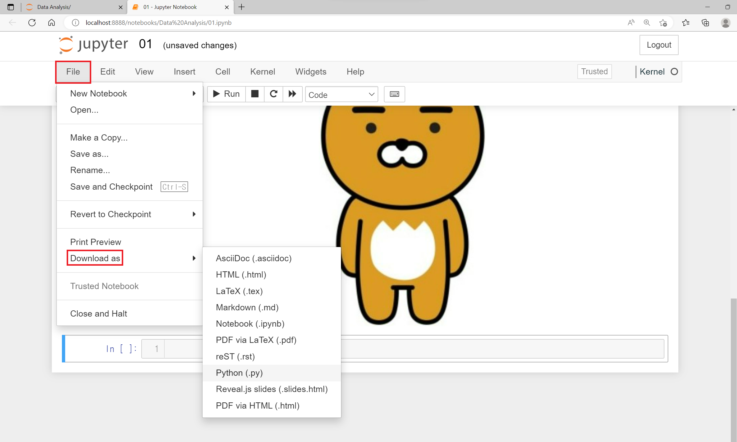 그리고 파일 형식을 바꾸어 코드를 저장하거나 다운로드하려면 File을 눌러 Download as를 선택해 주고 원하는 파일의 형식을 눌러 다운로드해 주면 됩니다.