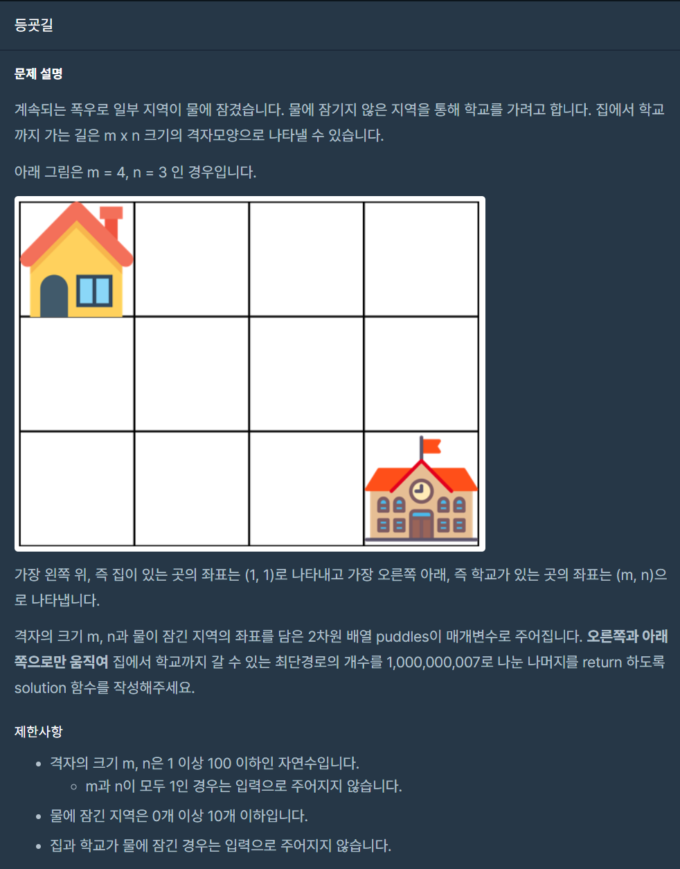 - 해당 위치로 올 수 있는 이전의 두 위치가 모두 물에 잠긴 부분이 아닐 경우 if ([j, i - 1] not in puddles) and ([j - 1, i] not in puddles)