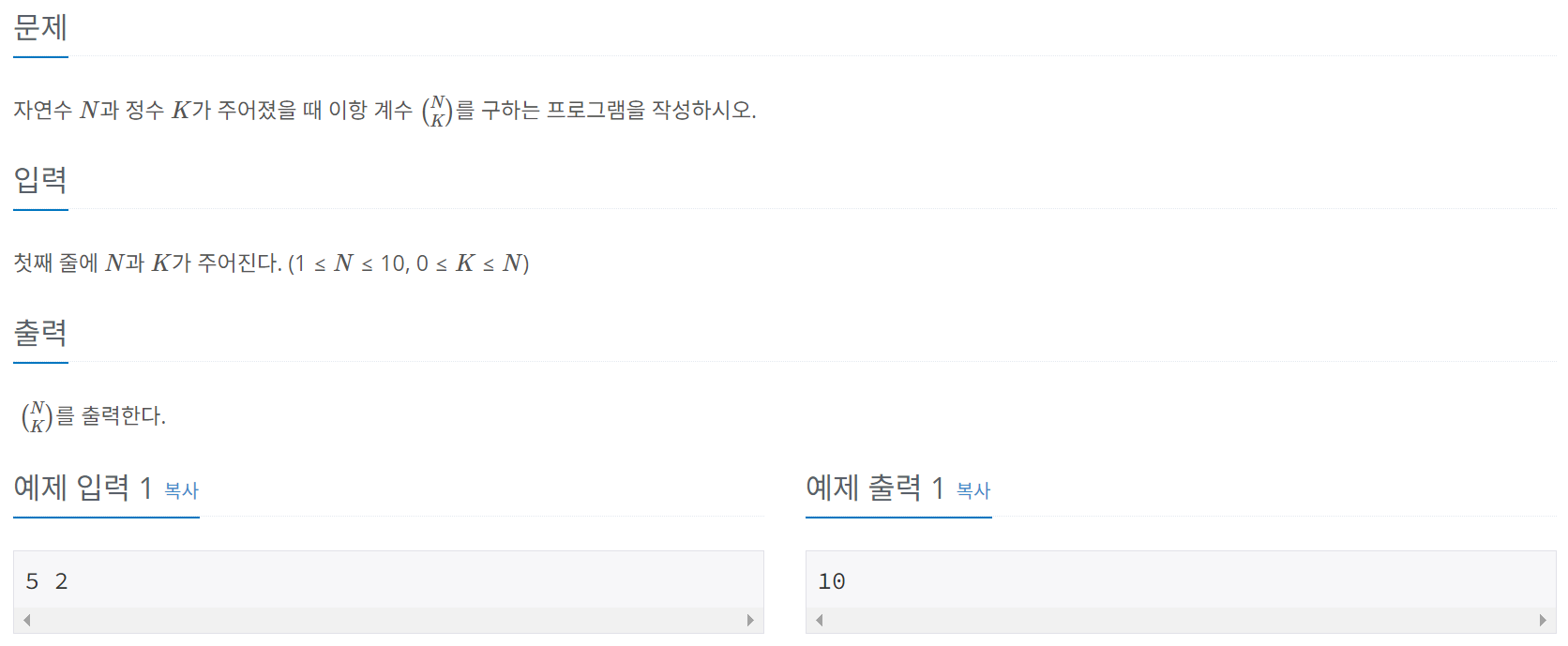 - 이항 계수를 구하여 출력한다. print(factorial(N) // (factorial(K) * factorial(N - K)))
