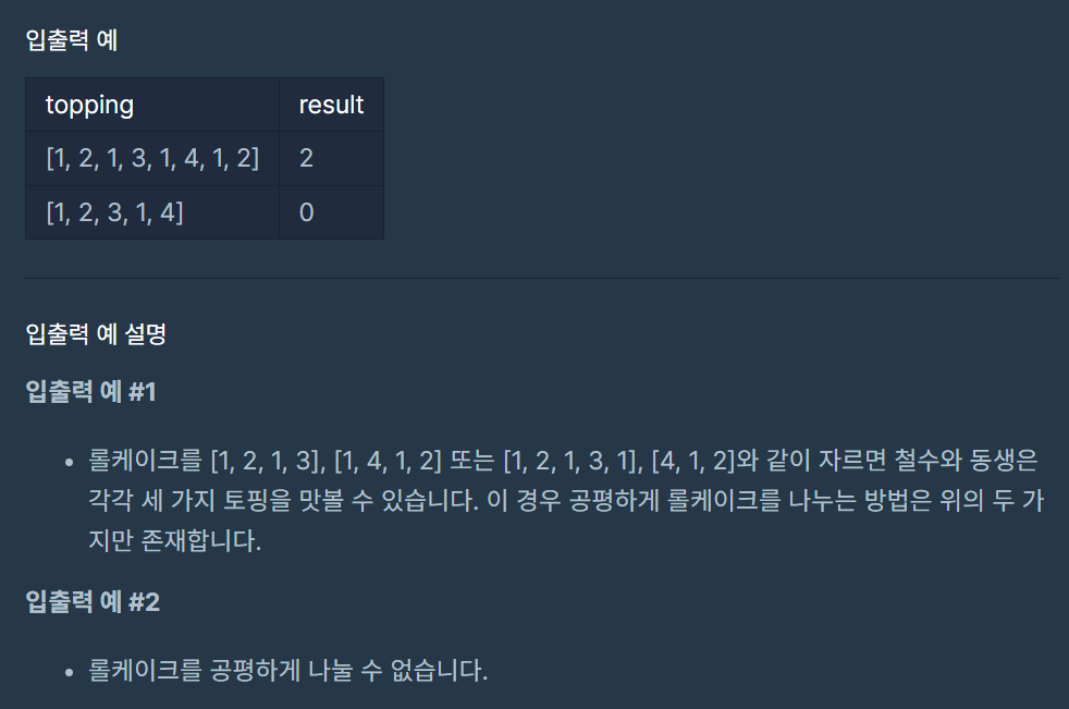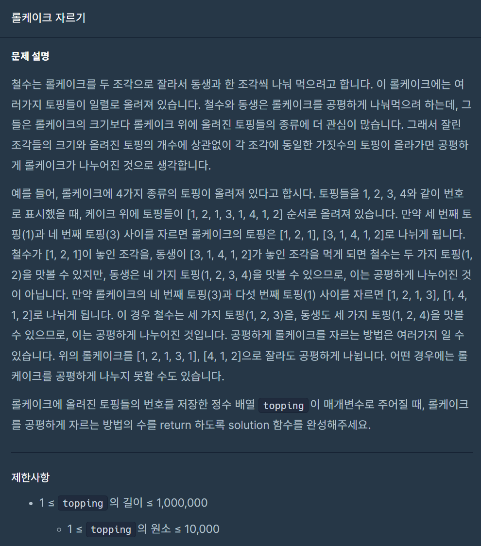 해당 문제는 롤케이크를 잘랐을 때, 두 조각의 토핑의 종류 개수가 동일한지 판단해야 하는 문제이다.