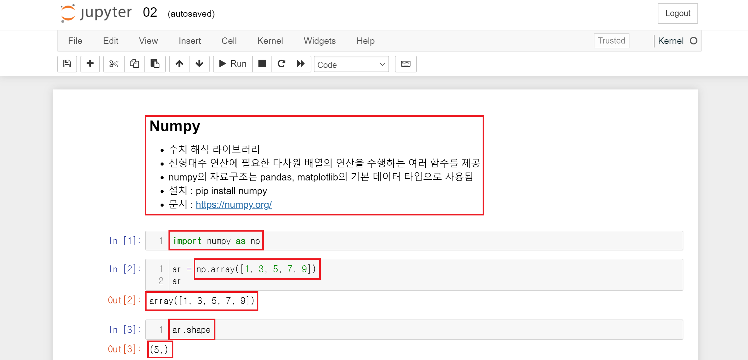 numpy 라이브러리를 np 이름으로 불러온 다음, np(=라이브러리).array(리스트) 형식으로 작성해 주면 해당 리스트가 배열의 형태로 반환됩니다.