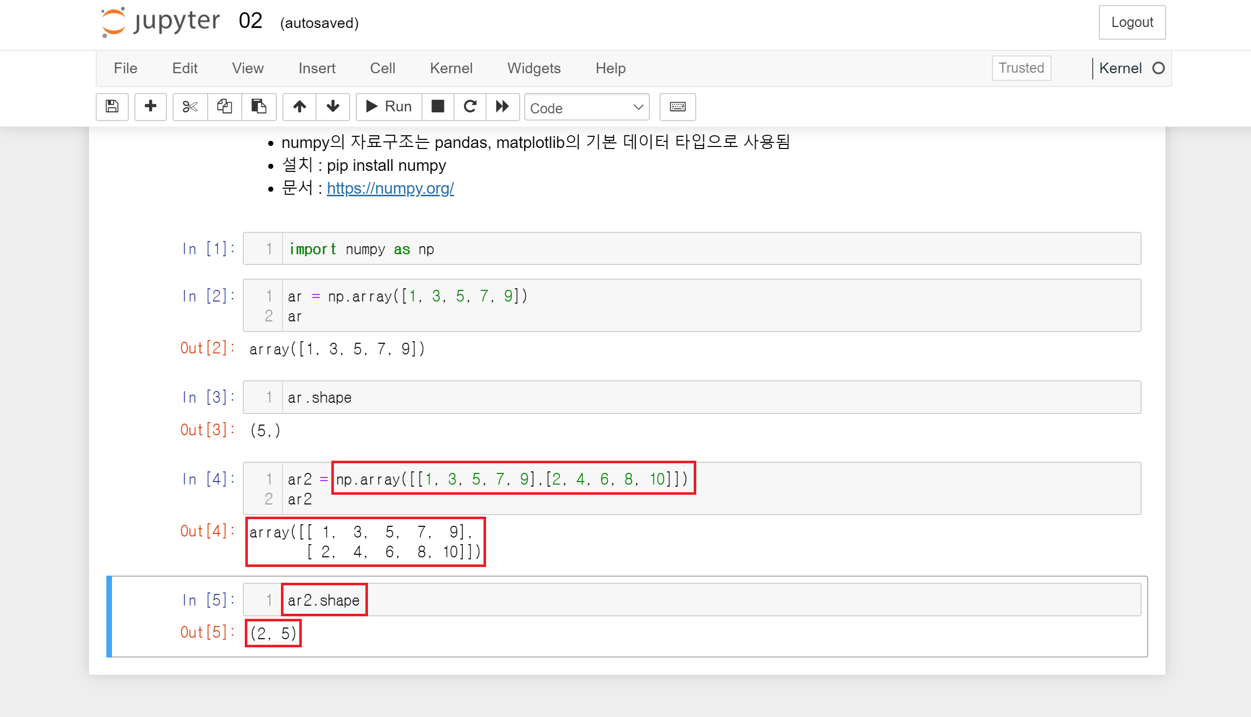 그리고 만들어진 배열의 shape를 출력해 보면 배열의 형태 즉, 행과 열의 값을 출력해 줍니다.