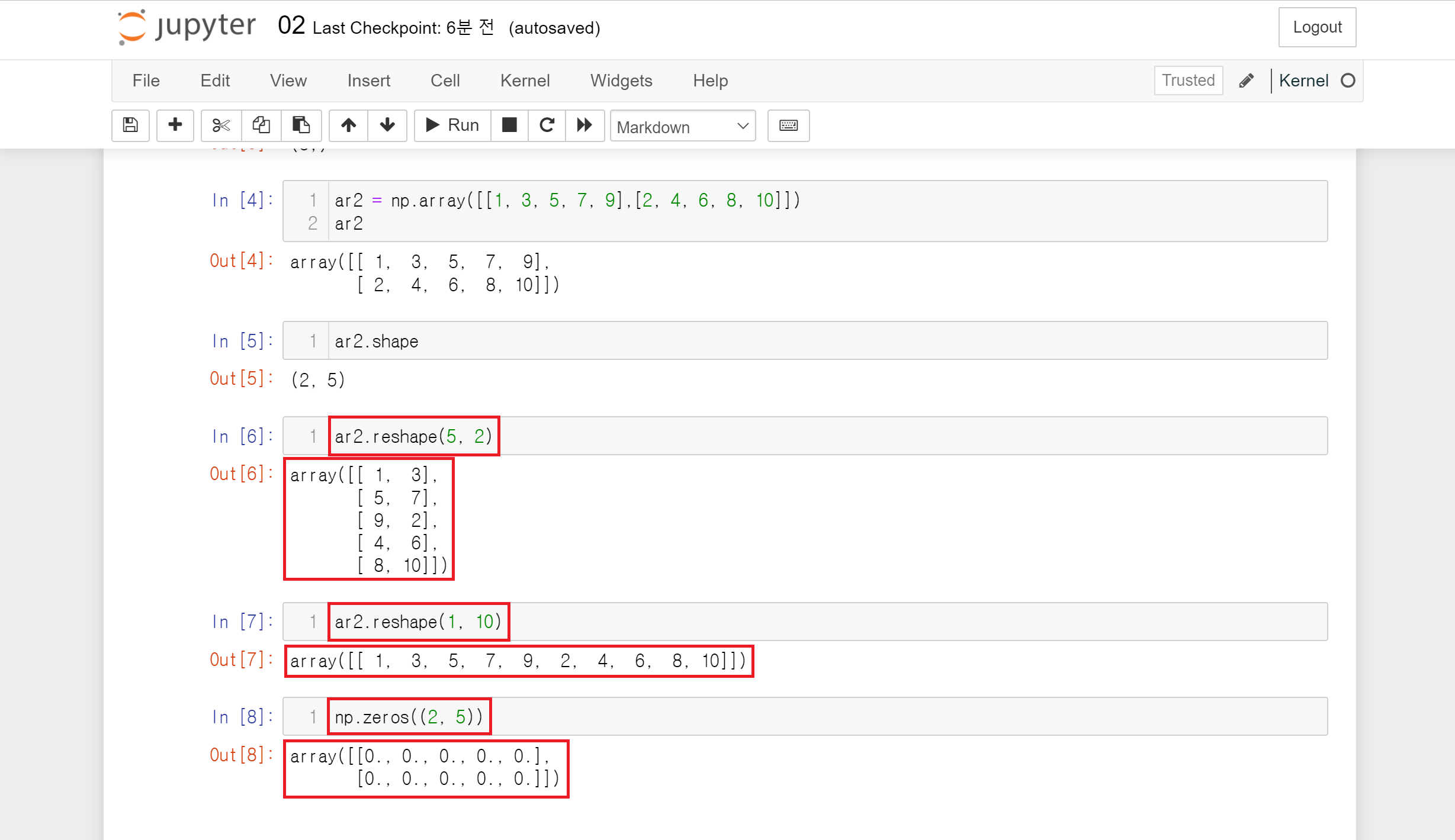 배열명.reshape(row, column) 형식으로 작성하면 해당 배열의 형태를 row 행과 column 열의 형태를 가진 행렬로 변환하여 출력해 줍니다. 이때 행렬의 원소 순서는 이전 행렬에서의 열 우선 방식으로 매겨진 순서와 일치합니다.