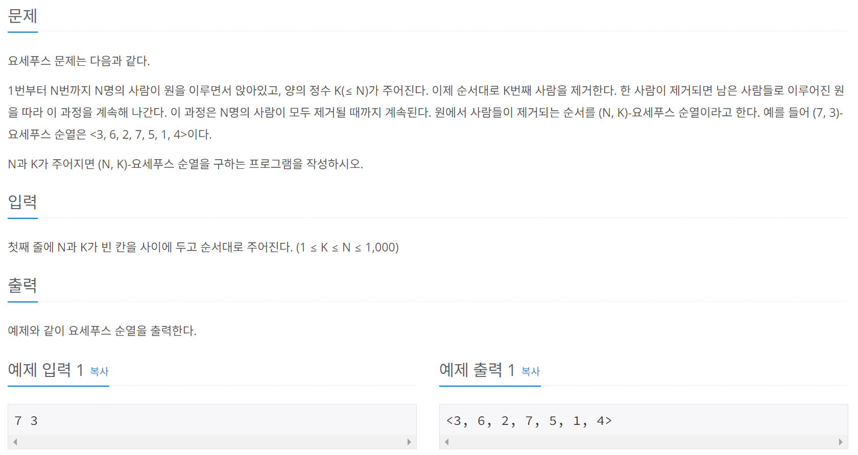해당 문제는 원형으로 앉은 사람을 차례대로 제거하는 문제이다.