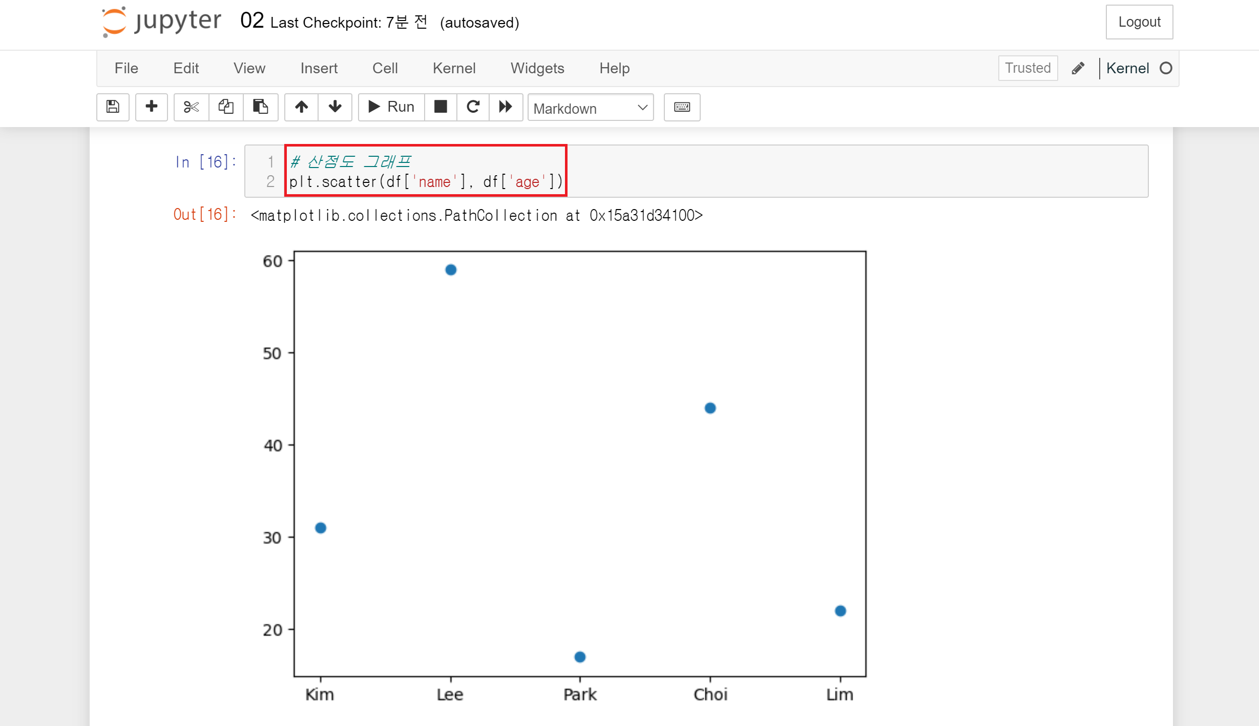 scatter(x축에 사용할 데이터, y축에 사용할 데이터) 형식으로 작성하면 해당 데이터를 x축과 y축으로 갖는 산점도 그래프가 생성됩니다.