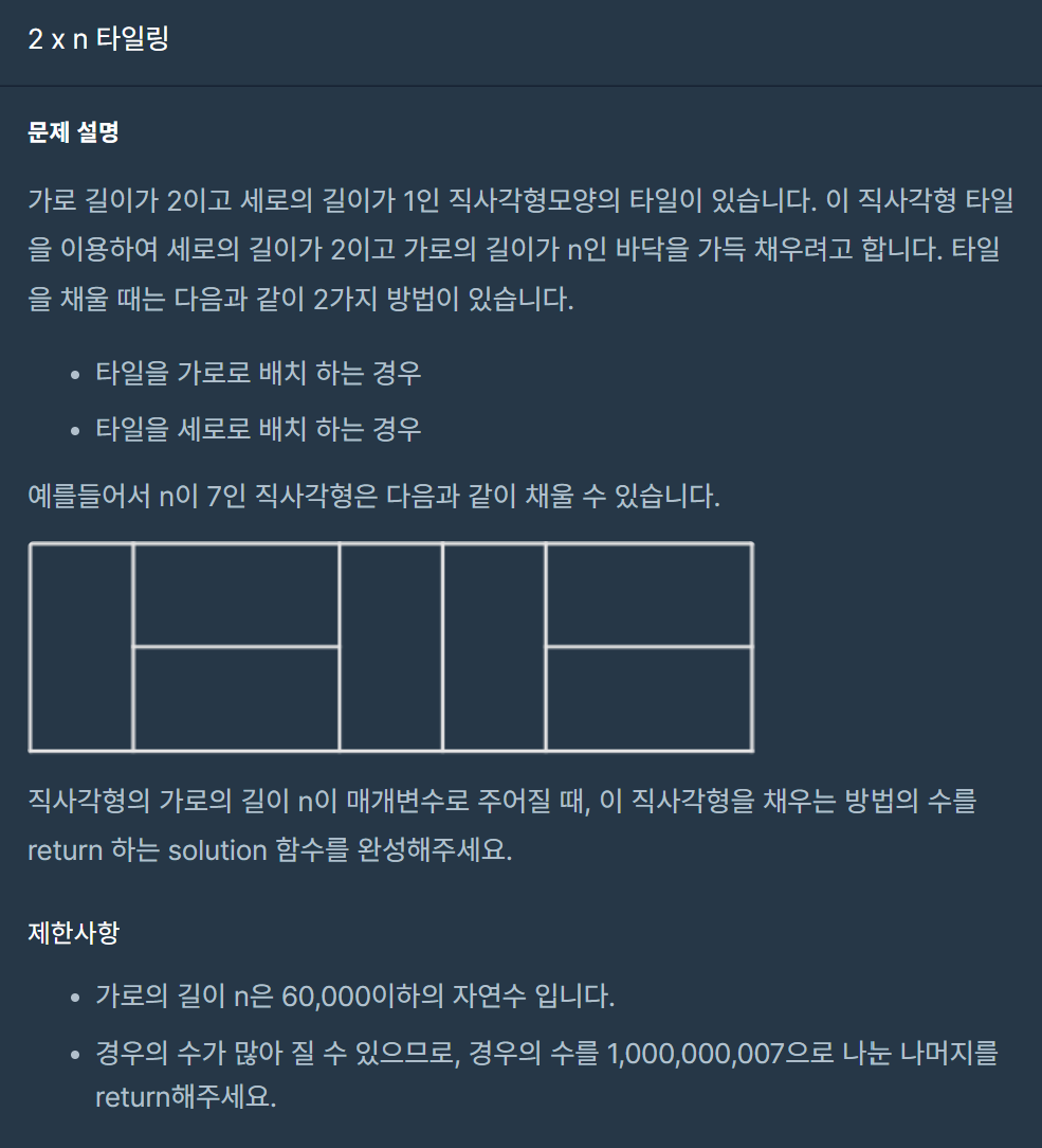 - 마지막에 n일 때의 결과를 1,000,000,007로 나눈 나머지를 저장한다. answer = count % 1000000007