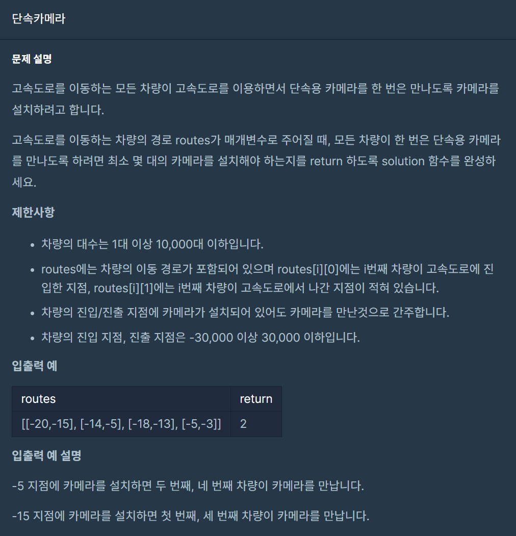 해당 문제는 카메라를 설치할 구간을 지정해 가며 최소한으로 카메라를 설치하는 개수를 구하는 문제이다.