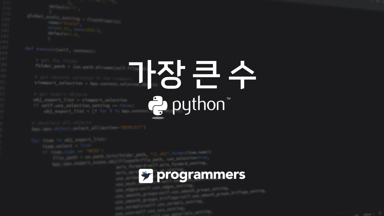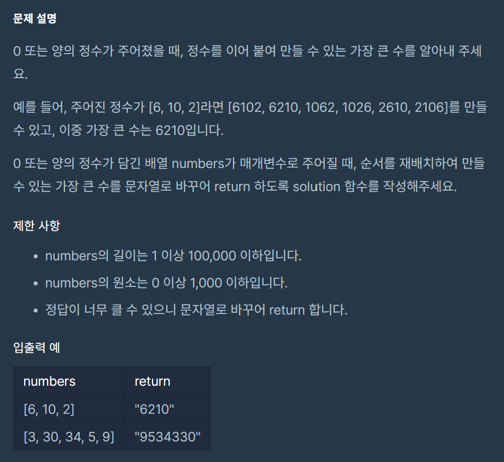 - 모든 수를 문자열로 바꾸고 4개를 이어붙인 문자열의 앞에서 4자리까지만 가지고 내림차순으로 정렬한다. numbers.sort(key = lambda x: (str(x) * 4)[:4], reverse=True)