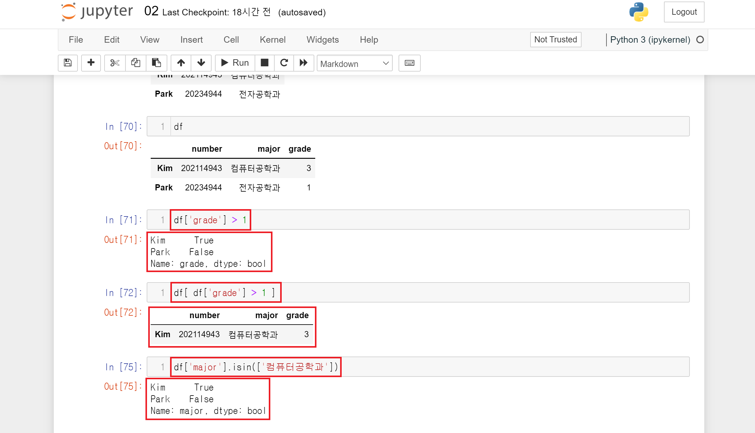 DataFrame 이름[조건] 형식으로 작성하면 해당 조건식을 만족하는 결과만 선택되게 됩니다.