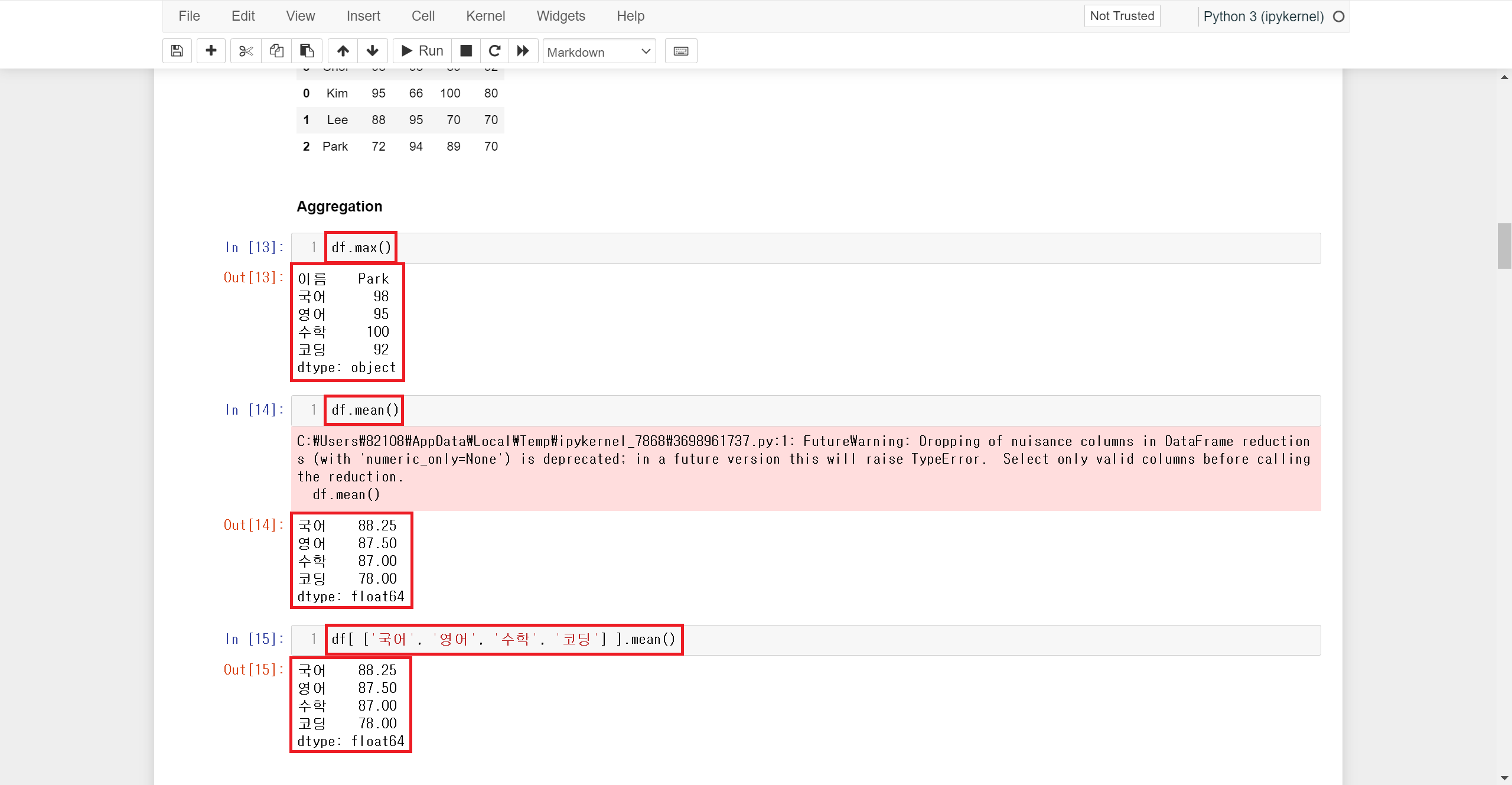 여기서 mean() 함수를 사용했을 때 이름이 들어있는 column 때문에 경고가 뜨는 것을 볼 수 있습니다.