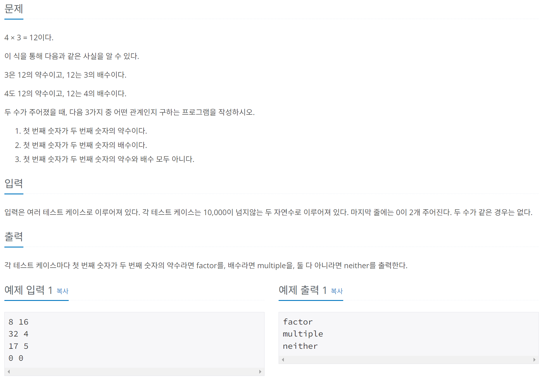 각 테스트 케이스마다 첫 번째 숫자가 두 번째 숫자의 약수라면 factor를, 배수라면 multiple을, 둘 다 아니라면 neither를 출력한다.