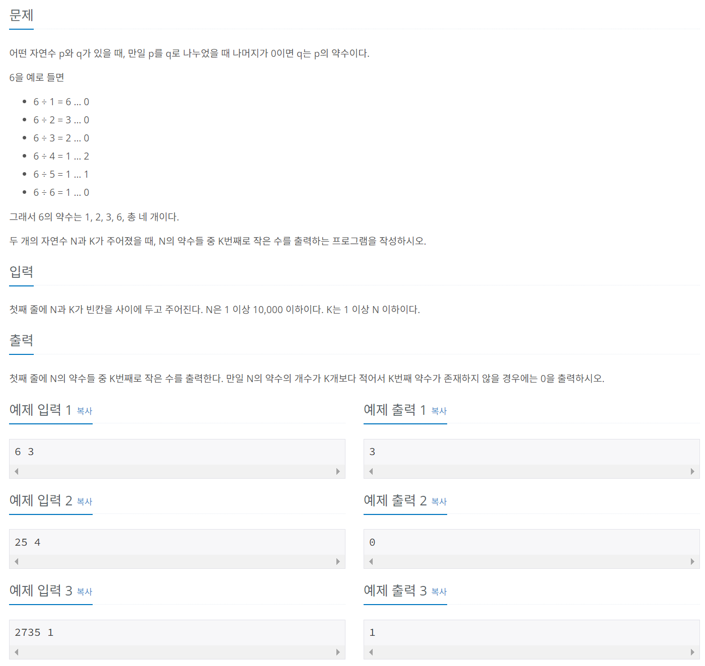 해당 문제는 약수를 구하고 원하는 순서에 위치한 약수를 출력하는 문제이다.