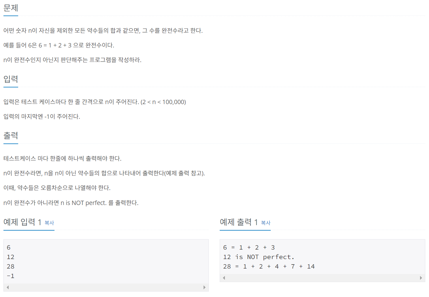 어떤 숫자 n이 자신을 제외한 모든 약수들의 합과 같으면, 그 수를 완전수라고 한다. 예를 들어 6은 6 = 1 + 2 + 3 으로 완전수이다. n이 완전수인지 아닌지 판단해주는 프로그램을 작성하라.