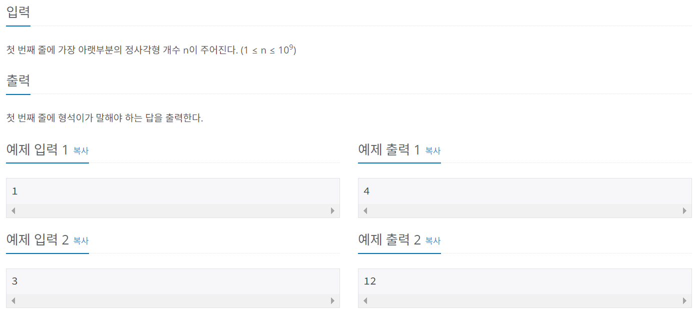- 따라서 모든 길이는 가장 아랫부분의 정사각형 개수의 4배이다. 해당 결과를 출력하면 된다. print(n * 4)