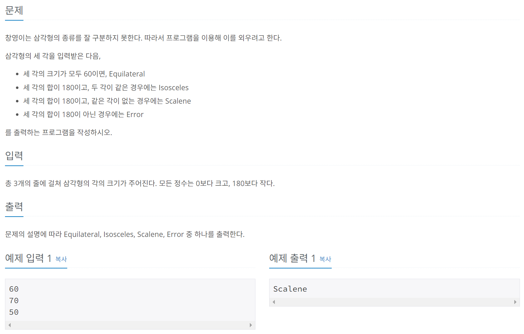 문제의 설명에 따라 Equilateral, Isosceles, Scalene, Error 중 하나를 출력한다.
