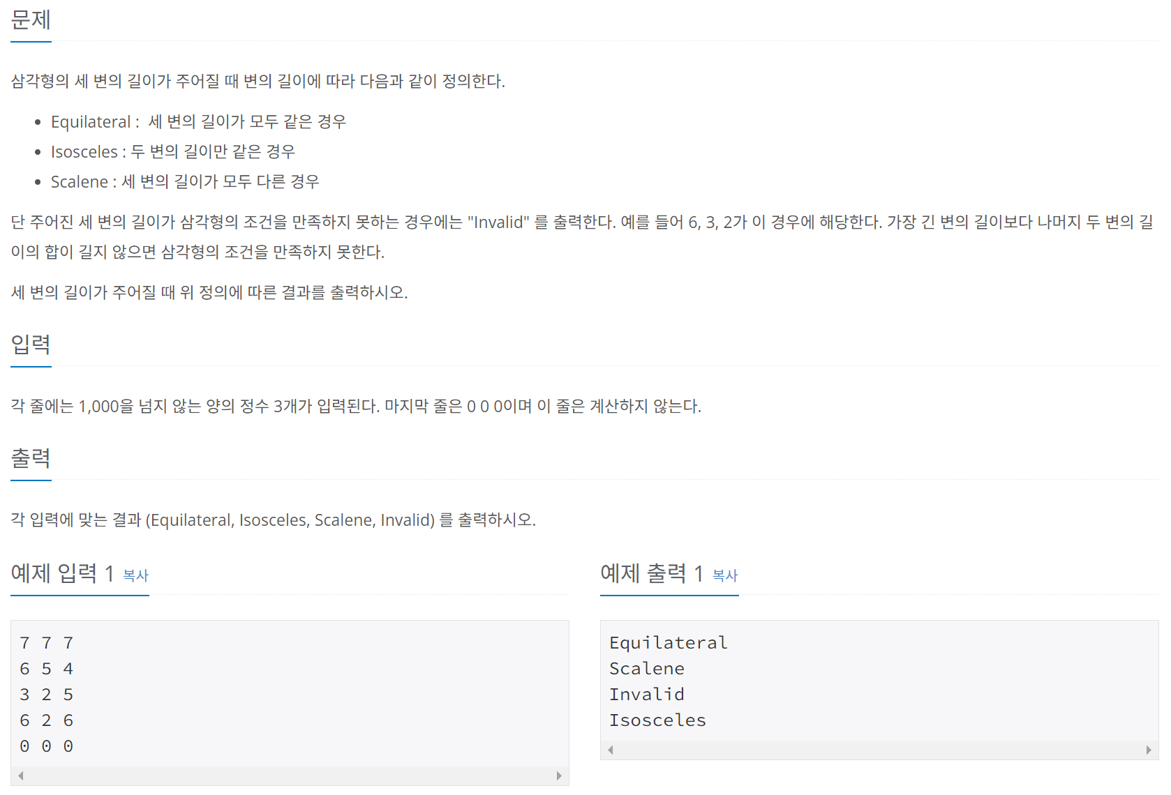 각 입력에 맞는 결과 (Equilateral, Isosceles, Scalene, Invalid) 를 출력하시오.