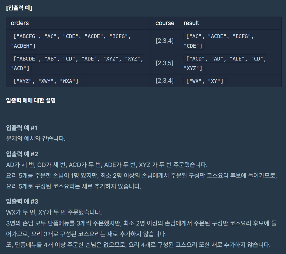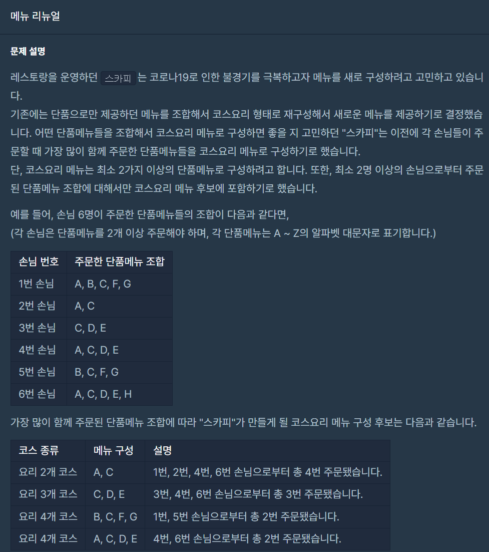 해당 문제는 단품 메뉴 2개 이상으로 구성된 가능한 코스요리를 구하는 문제이다.