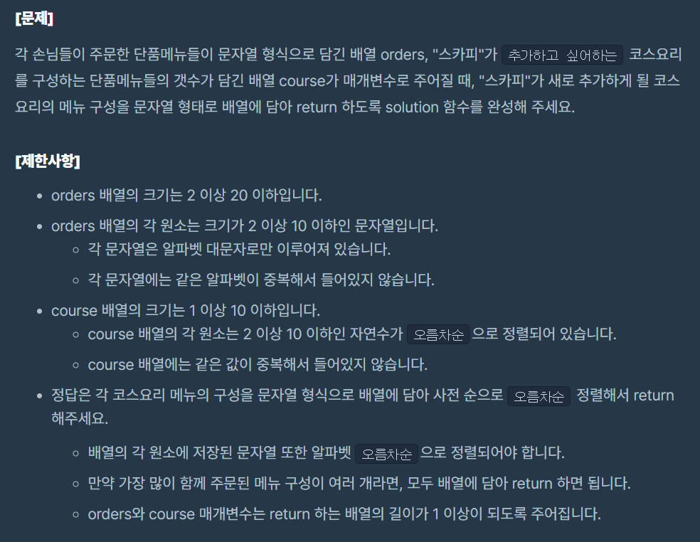 - 해당 리스트를 오름차순으로 정렬한 결과에서 코스요리의 개수만큼 선택하는 모든 조합의 결과를 리스트로 추출해 각 조합의 결과를 하나씩 불러온다. for k in list(combinations(sorted(j), i))