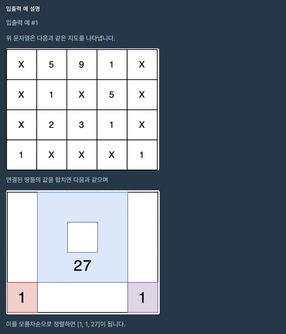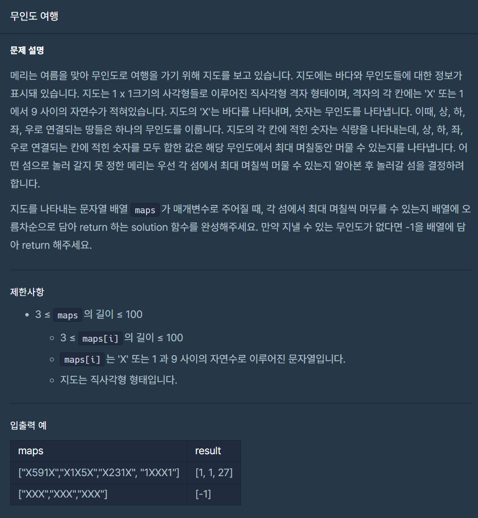 해당 문제는 무인도를 각각 찾아내어 머무를 수 있는 날을 계산한 뒤, 모든 무인도의 머무를 수 있는 날을 오름차순으로 정렬하는 문제이다.