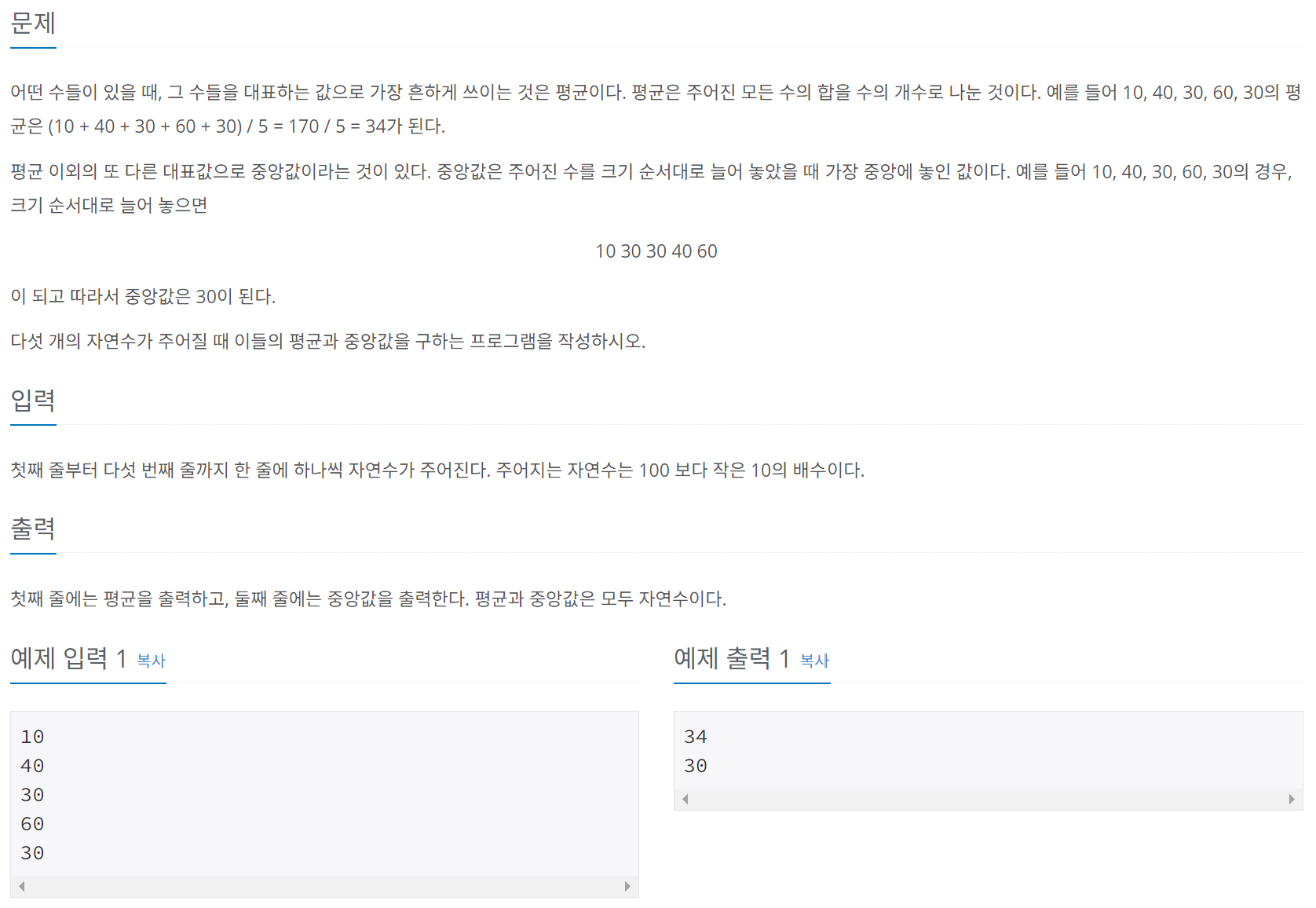 어떤 수들이 있을 때, 그 수들을 대표하는 값으로 가장 흔하게 쓰이는 것은 평균이다. 평균은 주어진 모든 수의 합을 수의 개수로 나눈 것이다. 예를 들어 10, 40, 30, 60, 30의 평균은 (10 + 40 + 30 + 60 +