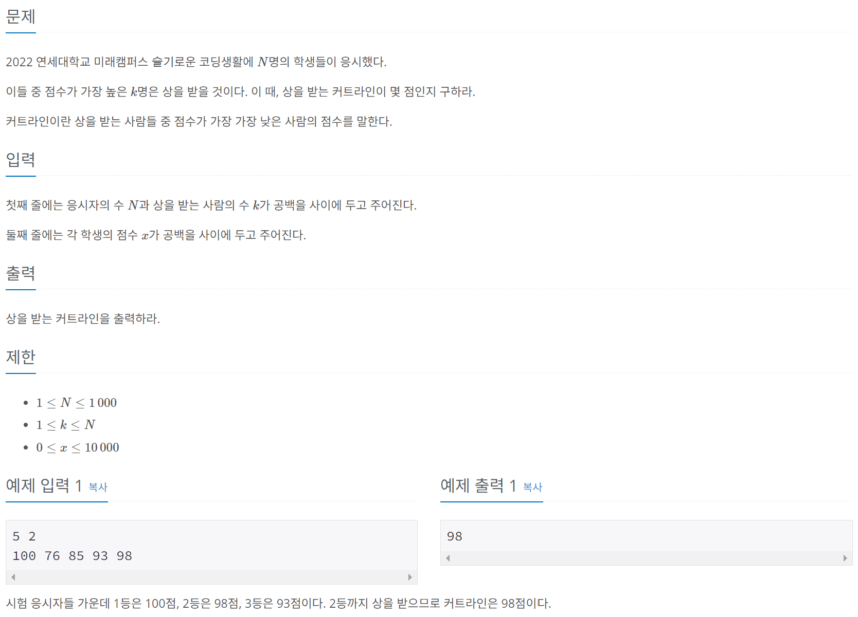 - 상을 받는 커트라인을 출력한다. print(x[-k])