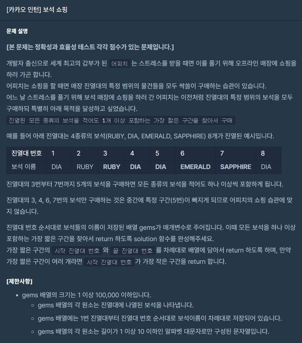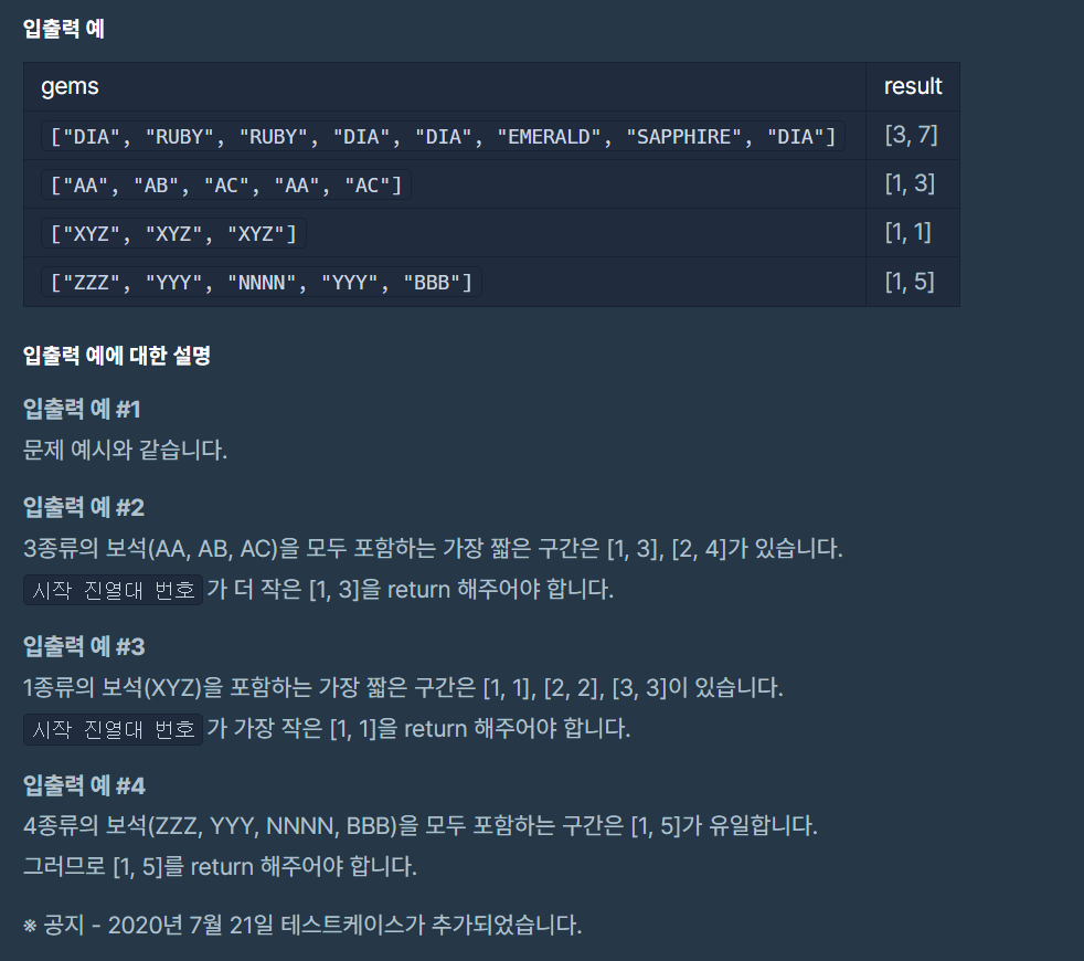 해당 문제는 보석의 모든 종류를 포함하는 구간 중 가장 짧은 구간을 구하는 문제이다.