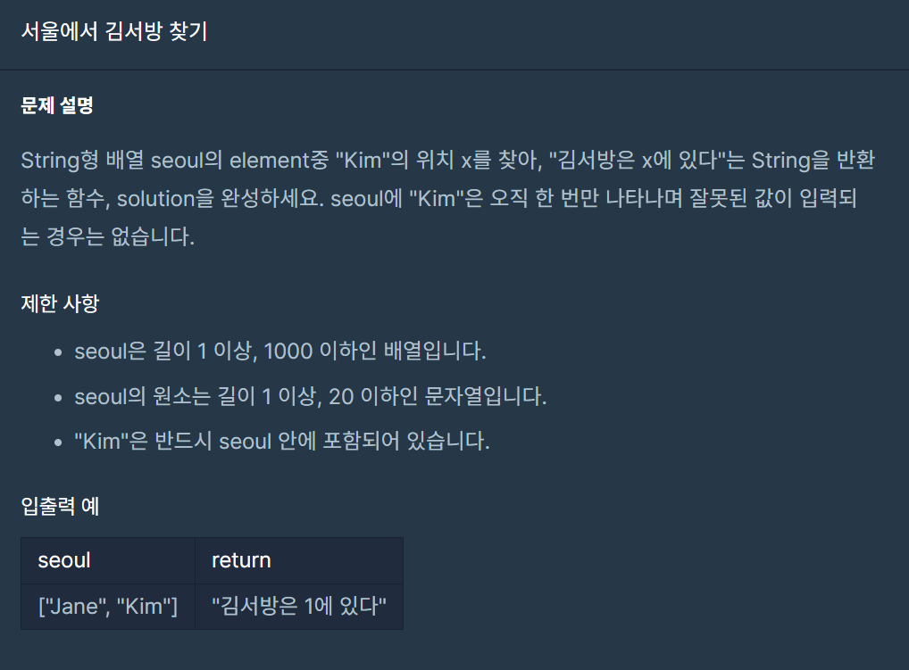 - 매개변수로 받은 배열 seoul 안에서 Kim을 찾아야 하므로 seoul의 모든 원소를 확인한다. for i in range(len(seoul))