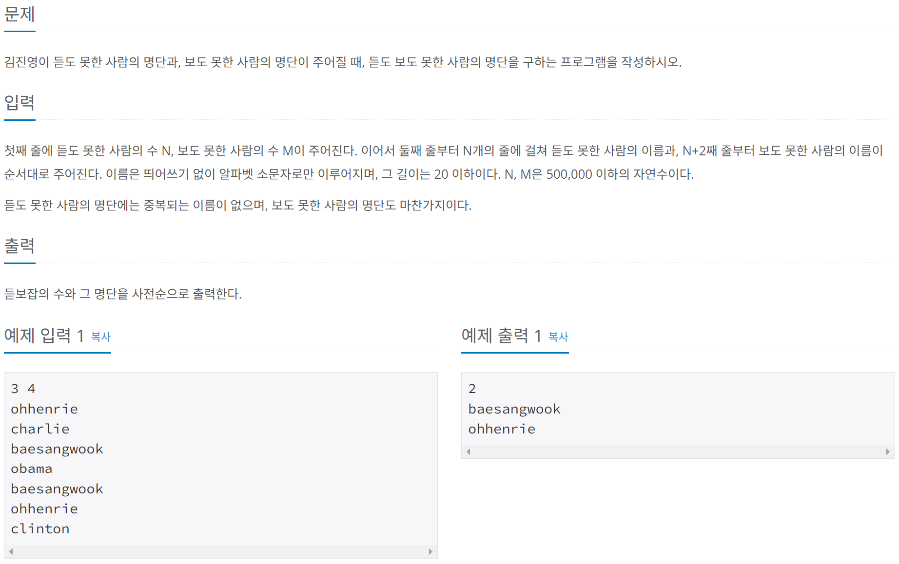 해당 문제는 듣도 못한 사람과 보도 못한 사람의 이름을 각각 입력받아 듣도 보도 못한 사람을 찾아내는 문제이다.