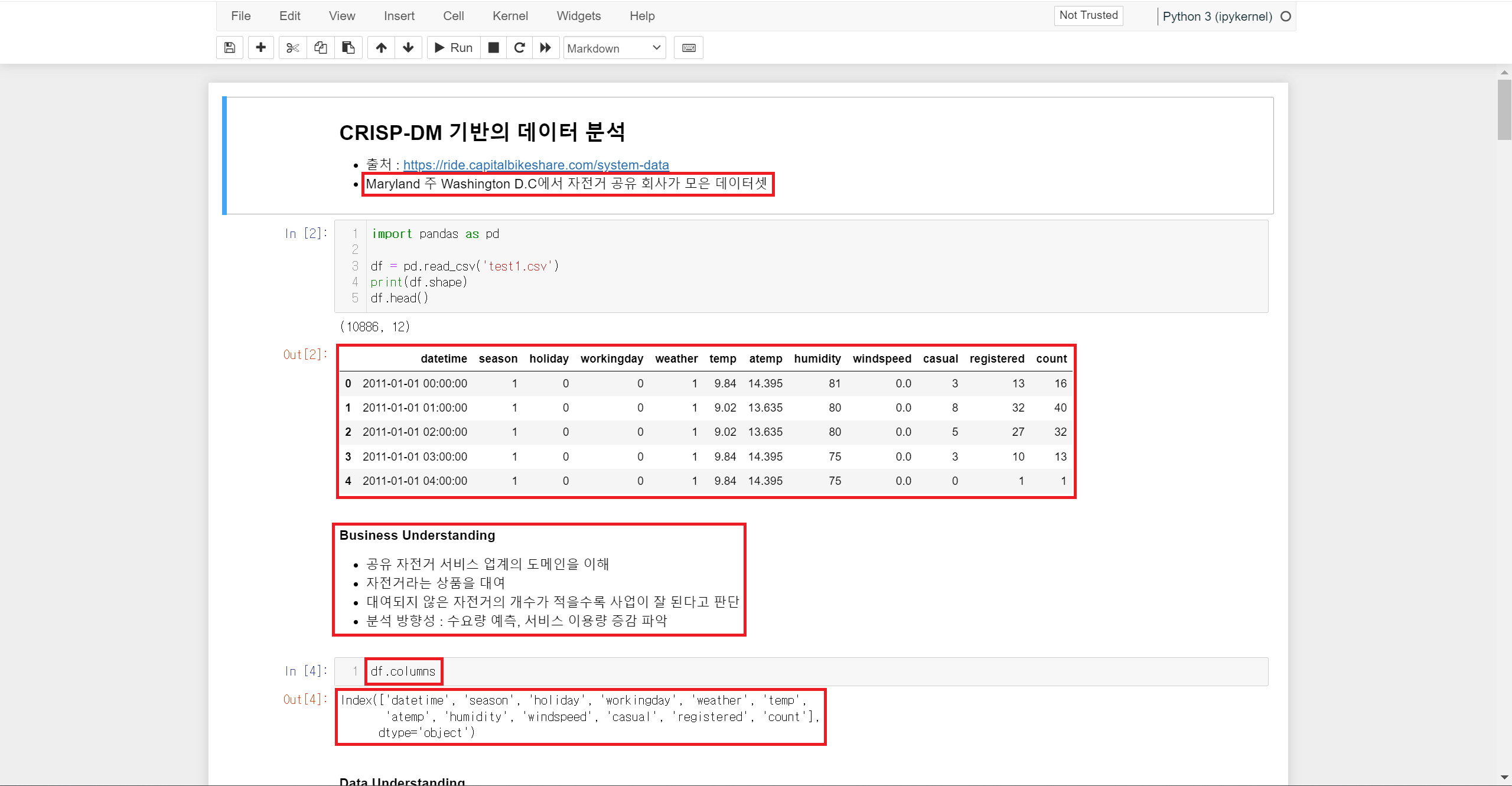가져온 데이터는 자전거 공유 회사가 모은 데이터로 공유 자전거 서비스 업계의 도메인 지식을 이해해야 합니다.