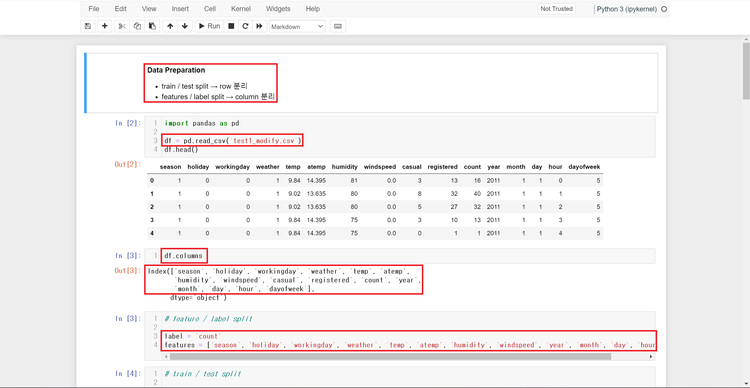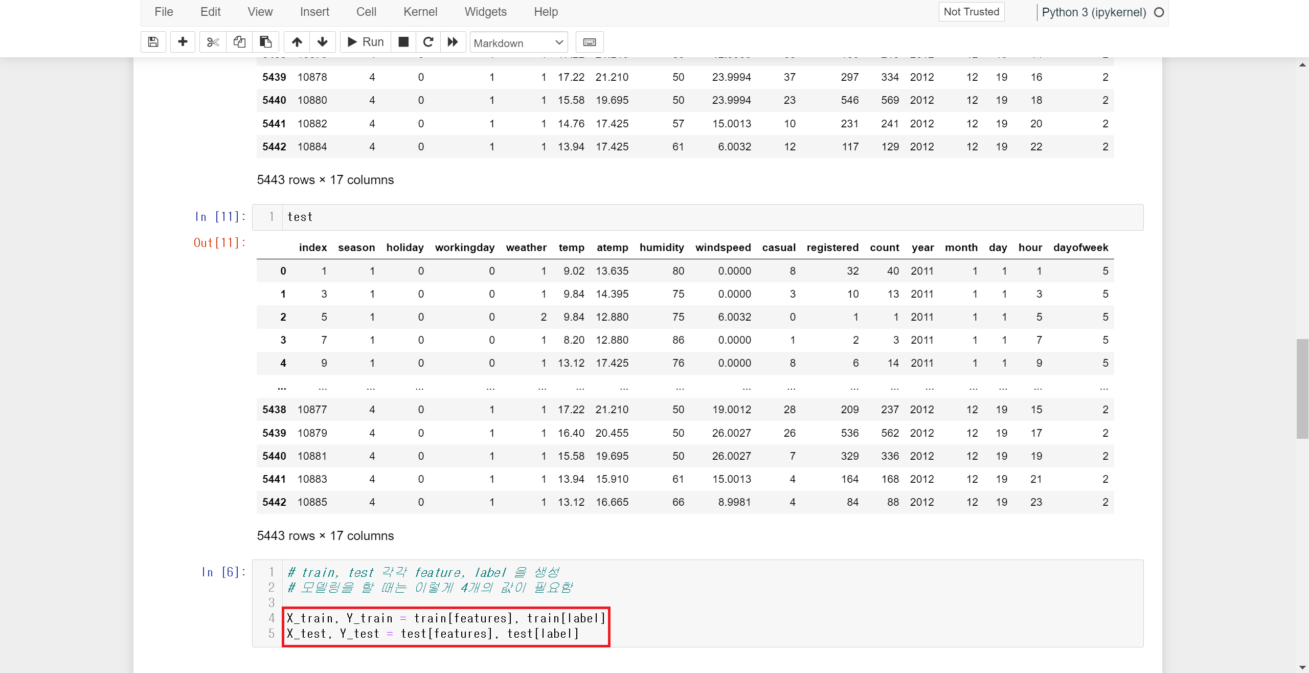 feature와 label은 함수에서 x, y 관계라고 했으므로 우선 크게 feature와 label을 구분하여 입력시켜줘야 합니다.