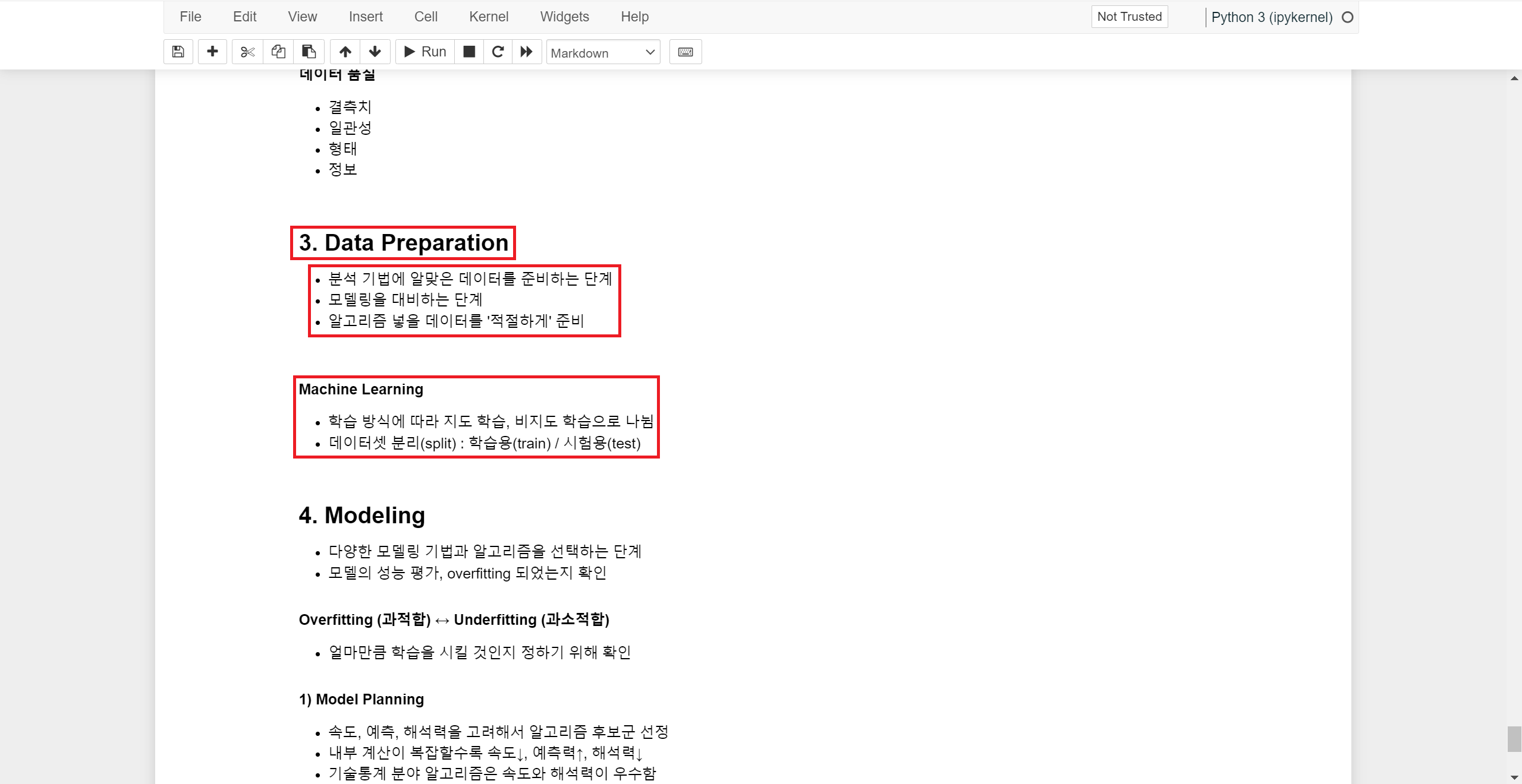 다음 단계인 Modeling 단계를 대비하는 단계로 알고리즘에 넣을 데이터를 적절하게 준비하는 단계라고 할 수 있습니다.