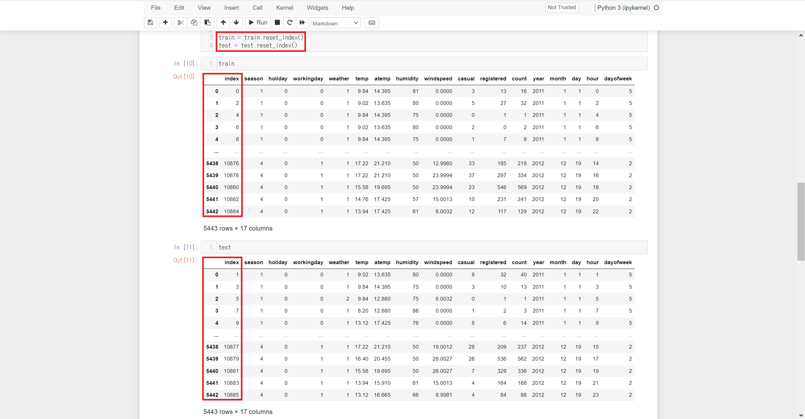 학습용과 시험용으로 분리한 데이터에 인덱스를 다시 설정하면 분리한 데이터를 다룰 때 더 깔끔해 보일 수 있습니다.