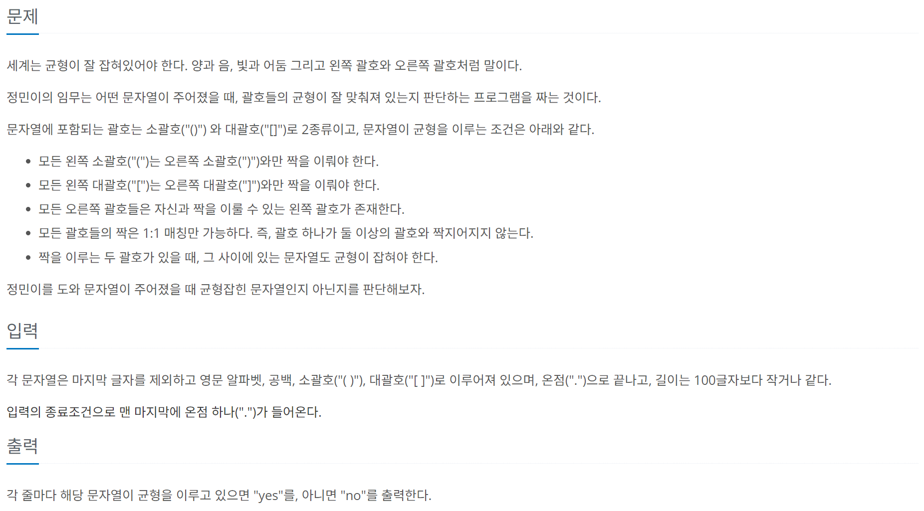 해당 문제는 괄호를 기준으로 균형 잡힌 문자열인지 판단하는 문제이다.