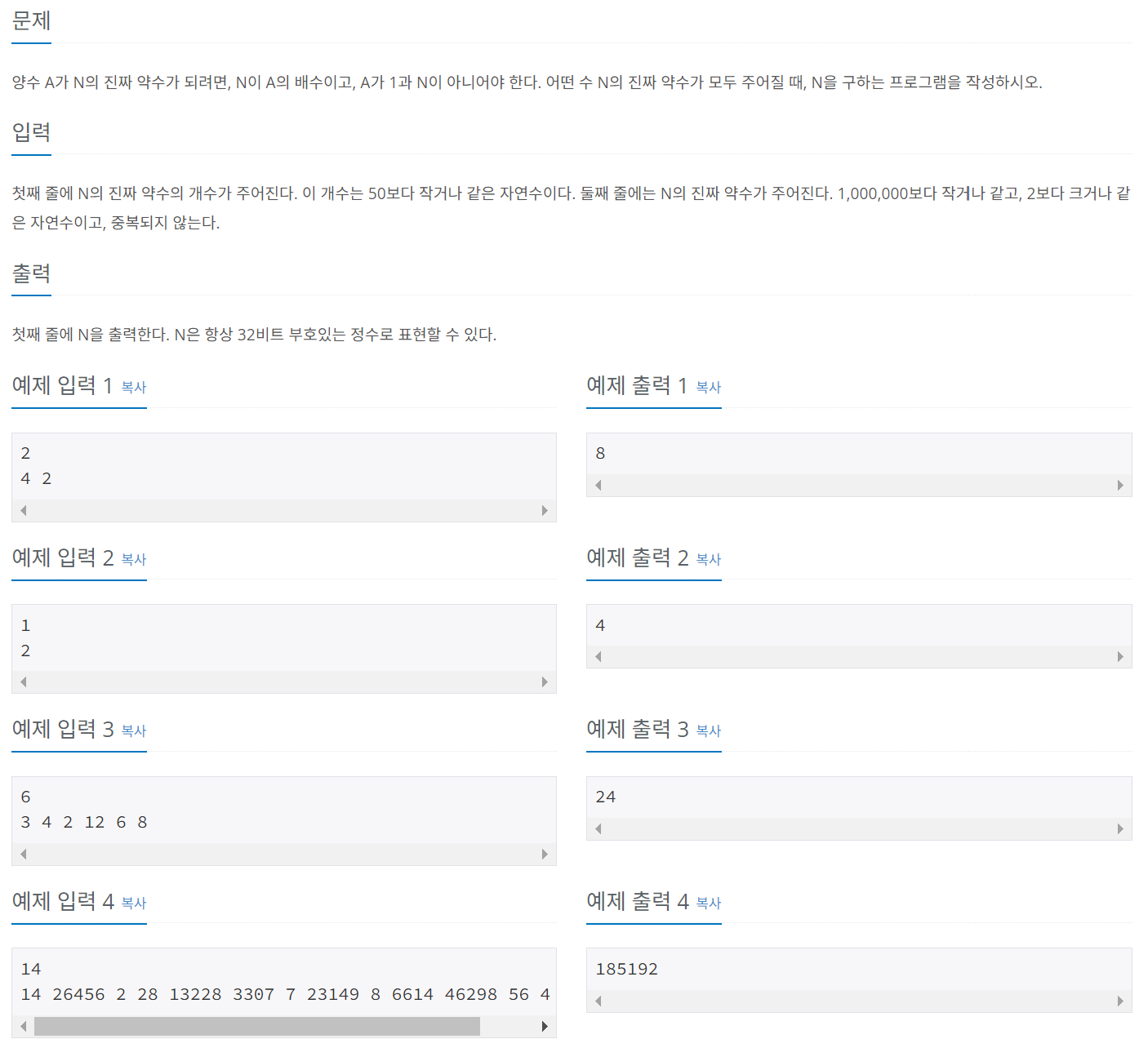 해당 문제는 진짜 약수를 보고 N을 구하는 문제이다.