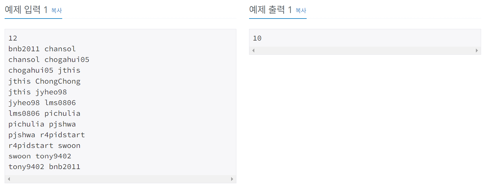 첫번째 줄에는 사람들이 만난 기록의 수 $N\ (1 \le N \le 1\ 000)$이 주어진다. 두번째 줄부터 $N$개의 줄에 걸쳐 사람들이 만난 기록이 주어진다. $i + 1$번째 줄에는 $i$번째로 만난 사람들의 이름 $A_i$