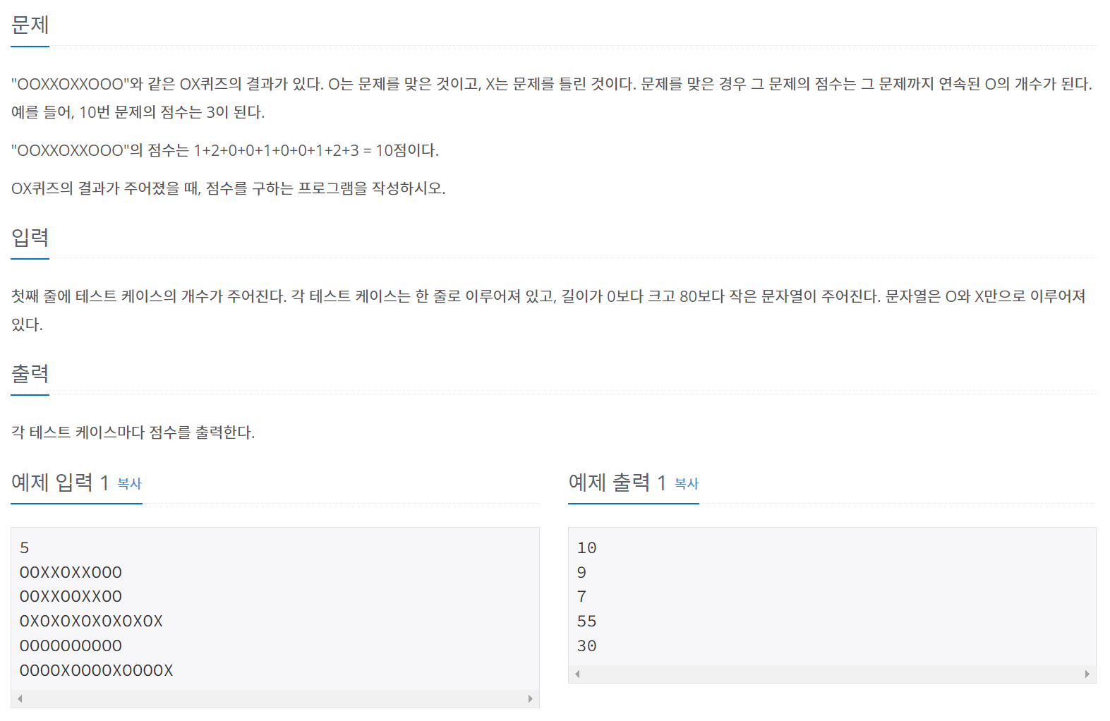 "OOXXOXXOOO"와 같은 OX퀴즈의 결과가 있다. O는 문제를 맞은 것이고, X는 문제를 틀린 것이다. 문제를 맞은 경우 그 문제의 점수는 그 문제까지 연속된 O의 개수가 된다. 예를 들어, 10번 문제의 점수